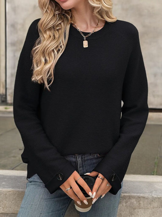 Classic Long Sleeve Crewneck Top with Button Cuff Detail