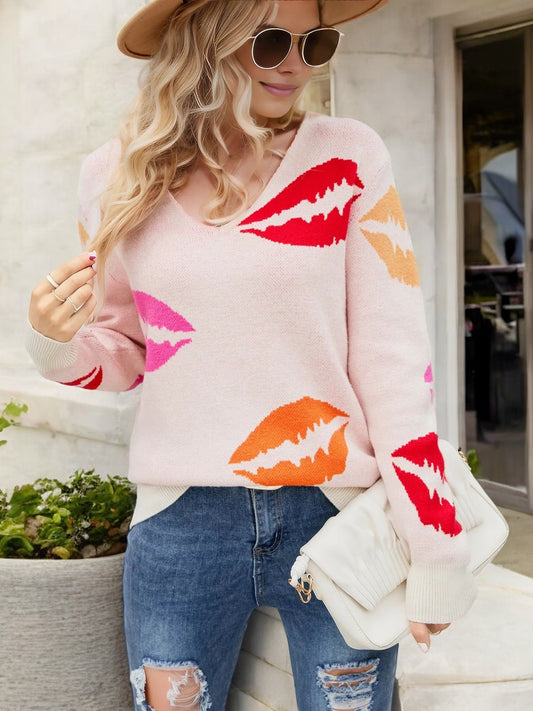 V-Neck Sweater with Lip Print Pattern and Oversized Fit