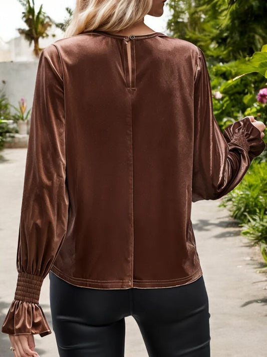 Velvet Long Sleeve Top with Lace Yoke and Smocked Cuffs
