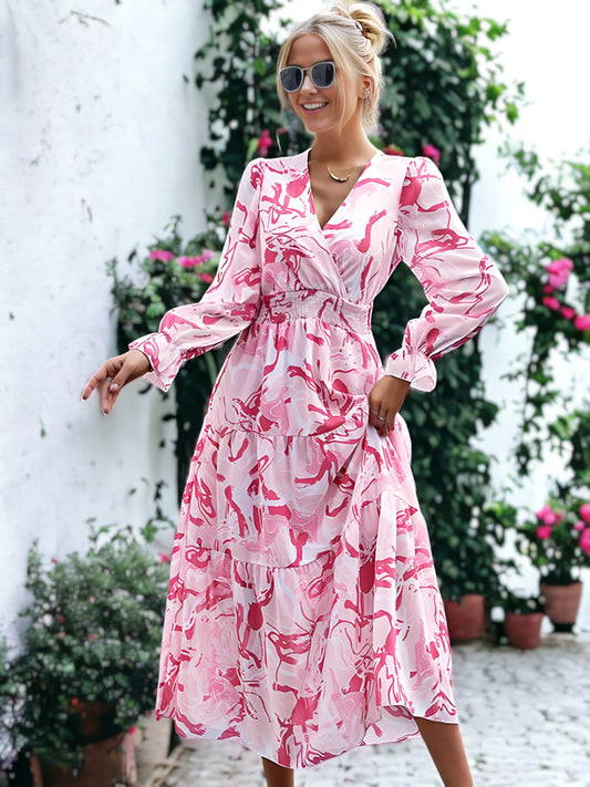 Long Sleeve Floral Print Dress with Bow Tie Neck and Pleated Skirt