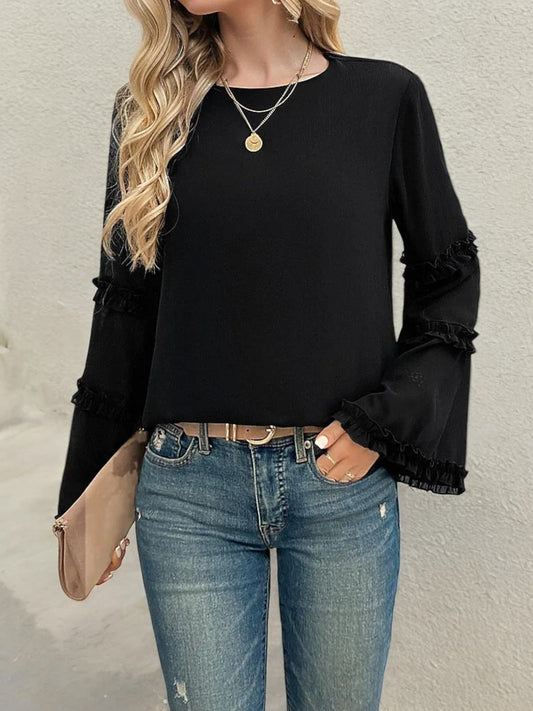 Bell Sleeve Top with Ruffle Trim Details and Crew Neckline