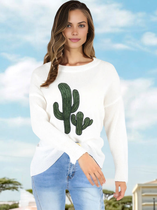 Anna-Kaci Women's Long Sleeve Knit Sweater with Cactus Embroidery and Crew Neck