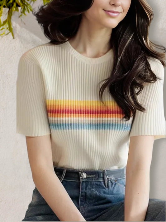 Anna-Kaci Women's Short Sleeve Ribbed Knit Sweater with Vintage Rainbow Stripes