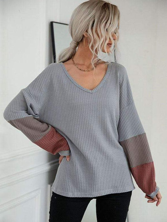 Notched V-Neck Bishop Long Sleeve Pullover Sweater