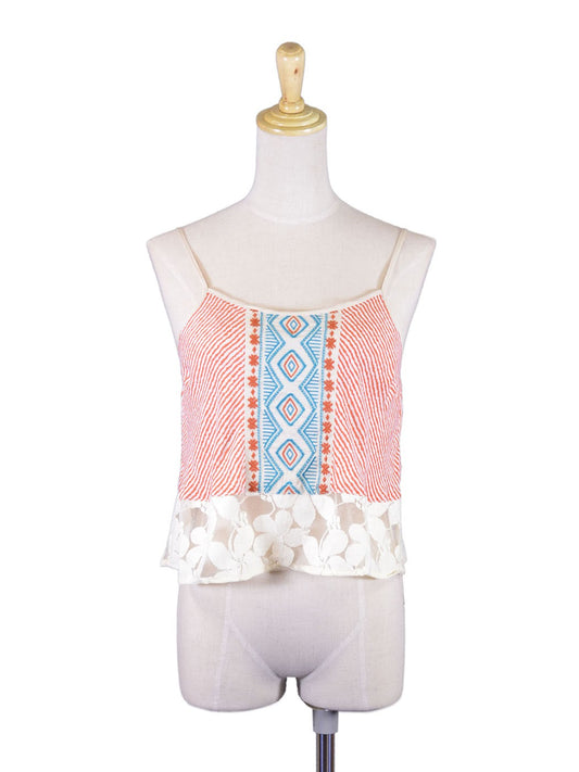 Flying Tomato Cute Stripped Embroidered Floral Mesh Lace Detail Woven Blouse Top