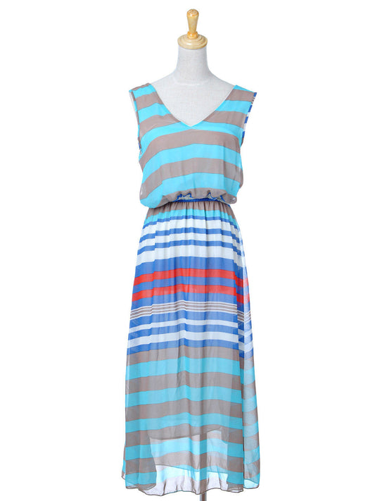 Blue Grey Nautical Stripe Sheer Chiffon Long Maxi Length Dress