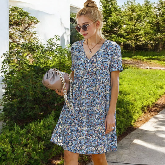 Anna-Kaci Women's Short Sleeve V-Neck Floral Print Swing Dress with Relaxed Fit