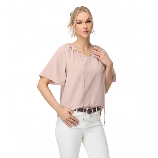 Anna-Kaci Women's Short Sleeve V-Neck Blouse with Gathered Shoulder Detail and Long Neck Tie Accent