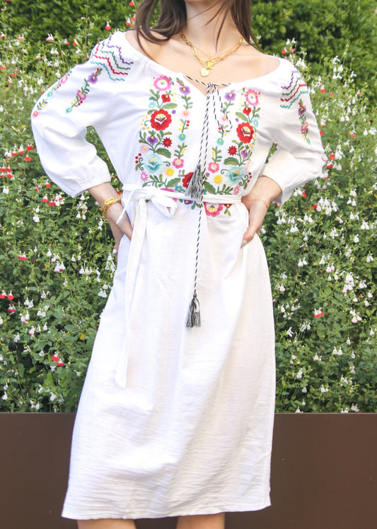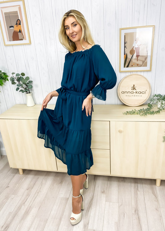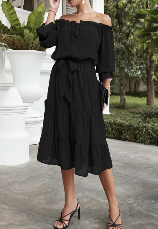 Vestido midi con hombros descubiertos y mangas abullonadas