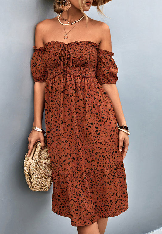 Vestido floral con hombros descubiertos y mangas abullonadas