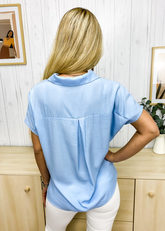 Blusa plisada con escote en V y botones con detalles y mangas con volantes