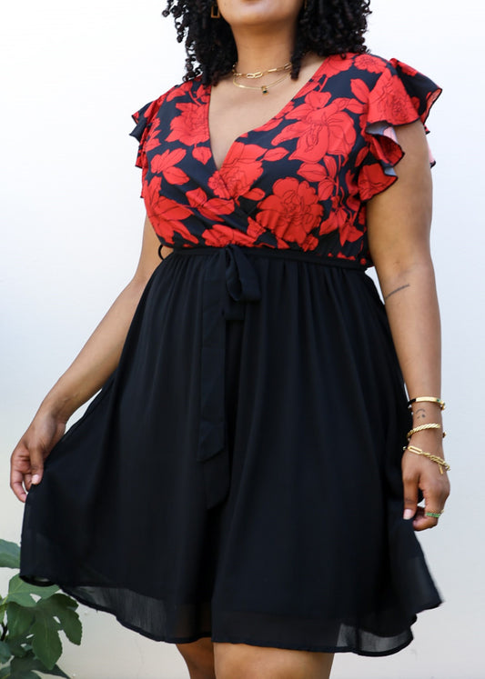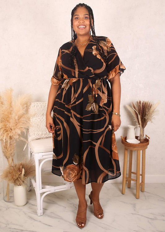 Vestido negro con estampado floral dorado en contraste y talla grande