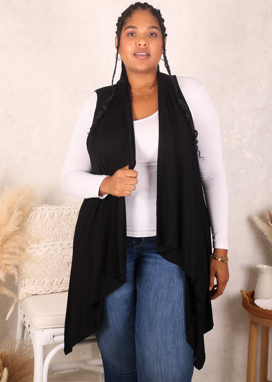Chaleco tipo cárdigan tipo chal sin mangas con abertura frontal de crochet estilo bohemio de talla grande, color negro liso