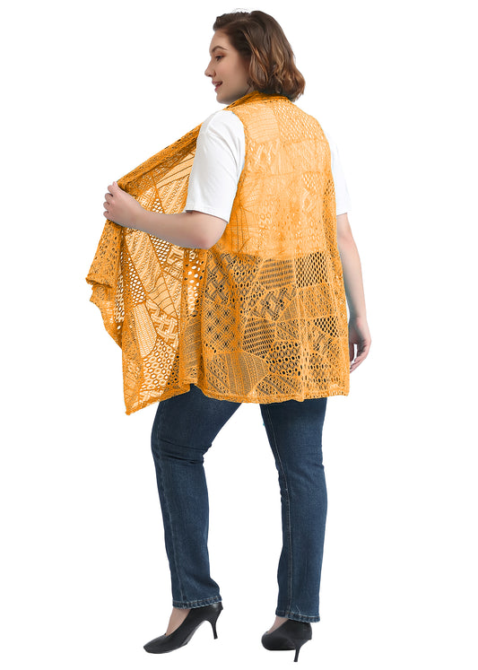 Chaleco tipo cárdigan tipo chal sin mangas con abertura frontal de crochet estilo bohemio de talla grande, amarillo