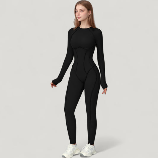 Anna-Kaci Active Women's Long Sleeve Fitted One-Piece Activewear Jumpsuit with Contoured Stitching and Open Back Design