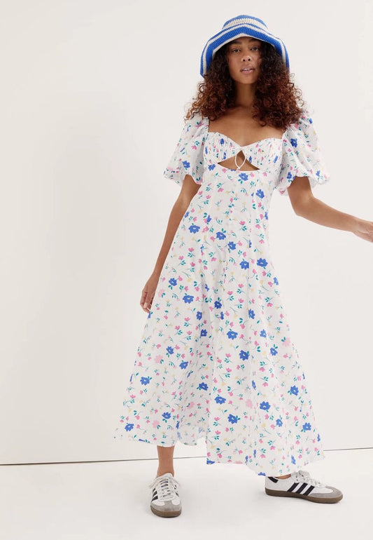Vestido largo cruzado con espalda fruncida y estampado floral con mangas abullonadas