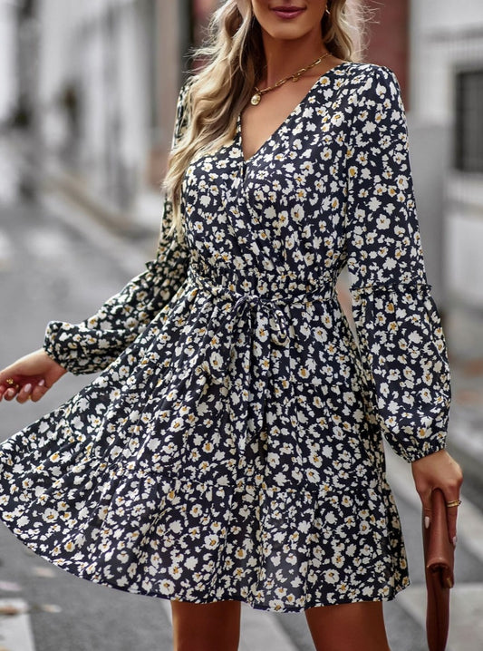 Vestido corto con cuello en V, mangas holgadas, cintura con lazo y botones estampados