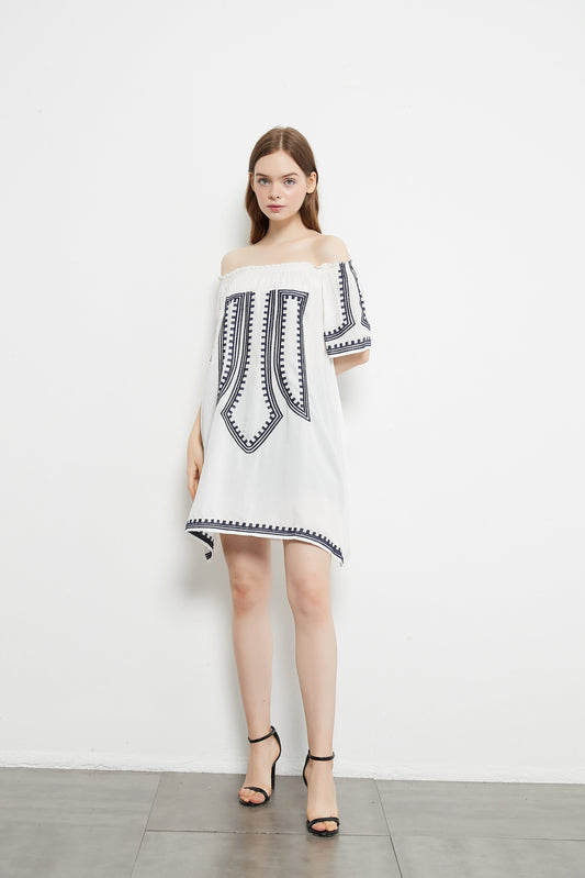 Vestido fruncido con hombros descubiertos y estampado versátil