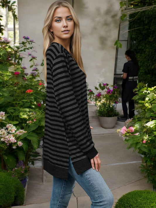Striped Long Sleeve Knit Top with Side Slit Detail