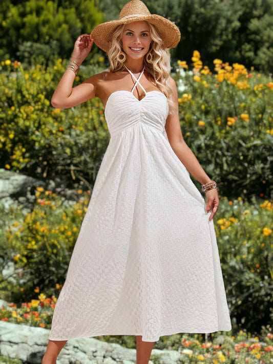 Vestido midi con cuello halter y tirantes finos cruzados de lunares suizos