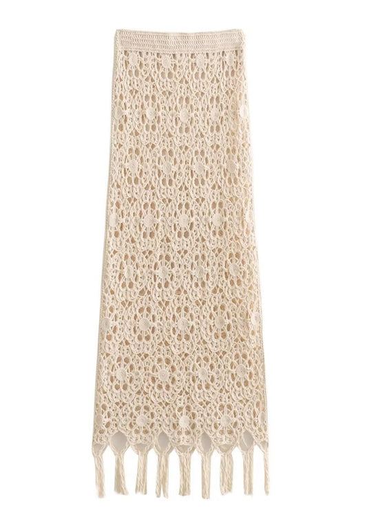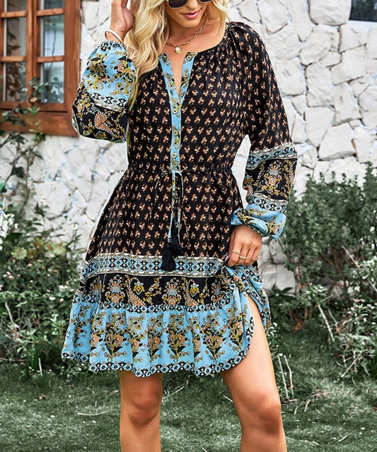 Vestido con estampado bohemio, cuello con lazo y borlas