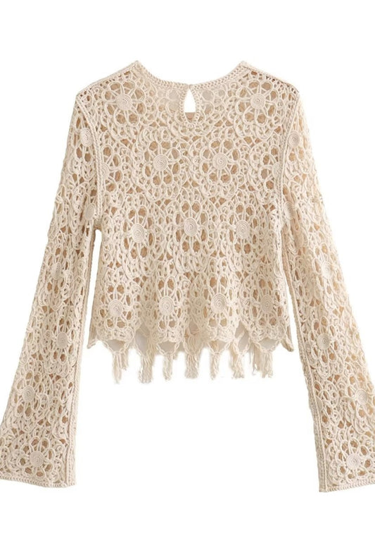 Blusa con mangas abullonadas y cuello con lazo y borlas