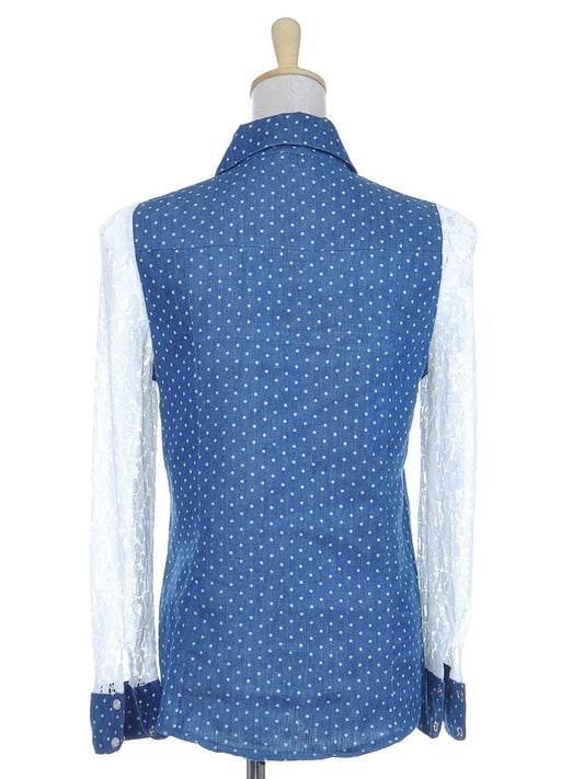 Blusa de mujer de mezclilla azul con estampado de lunares y flores, manga larga y botones