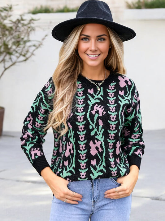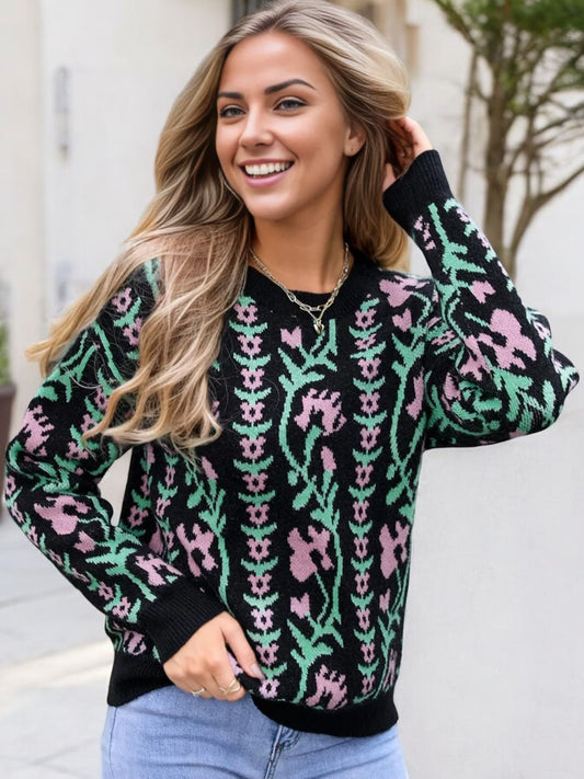 Suéter de punto floral con cuello redondo y mangas largas para mujer de Anna-Kaci