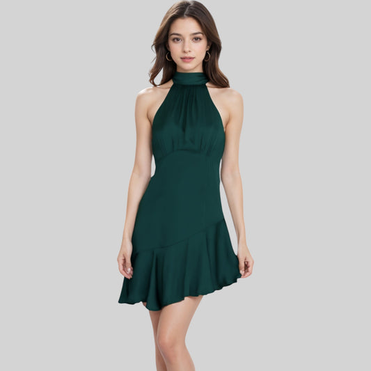 Anna-Kaci Women's Halter Neck Mini Dress with Asymmetrical Ruffle Hem and High Neck Detail