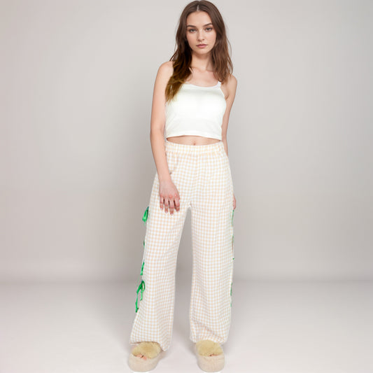 Anna-Kaci Women's Gingham Wide Leg Pants with Elastic Waistband Contrast Side Ribbon Tie Details and Relaxed Full-Length Fit
