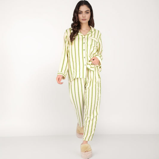 Anna-Kaci Women's Green Striped Long Sleeve Pajama Set with Button-Up Top Chest Pocket and Relaxed Straight-Leg Pants