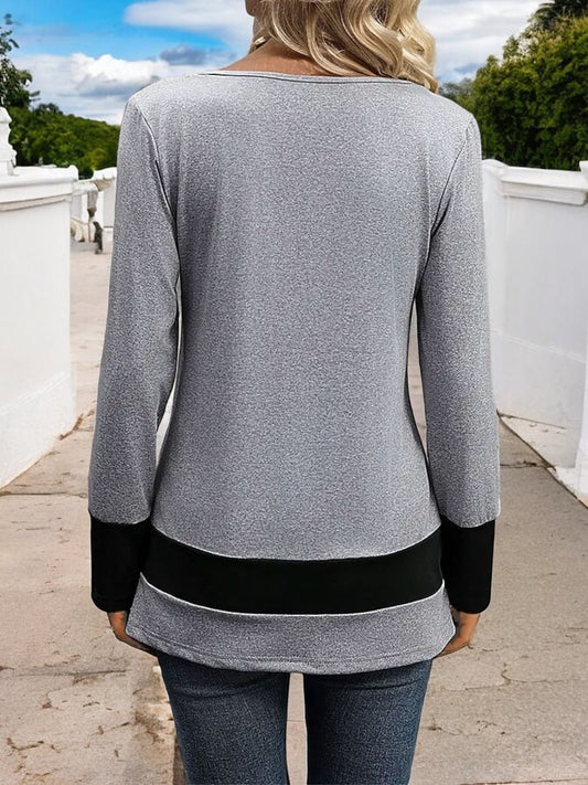 Anna-Kaci Women's Long Sleeve Color Block V-Neck Top with Button Accents and Stylish Hemline