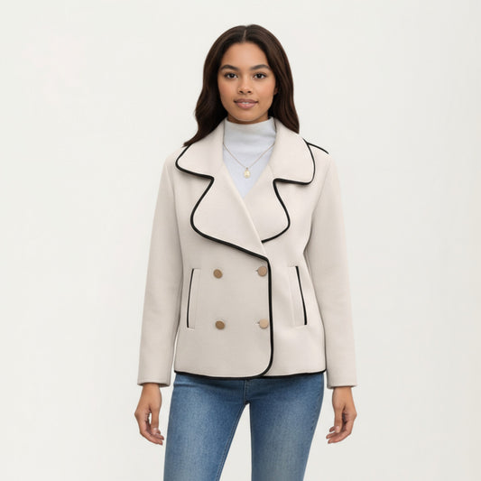 Anna-Kaci Women's Double-Breasted Peacoat Jacket with Contrast Piping and Wide Lapel Collar