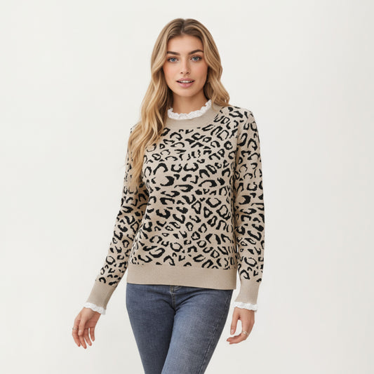 Anna-Kaci Women's Leopard Print Knit Sweater with Ribbed Trim and Long Sleeves