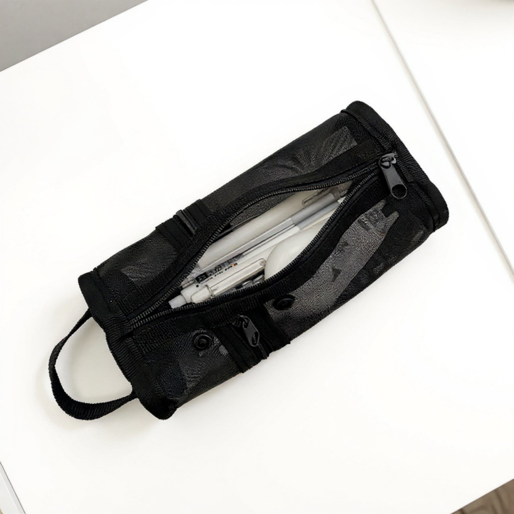 The Anna-Kaci Cylindrical Mesh Pencil Case combines functionality with a sleek, modern design. Crafted from lightweight, transparent mesh material, it allows easy visibility of your stationery while maintaining a clean and stylish look. Dual zippers provide organized storage for pens, pencils, and small accessories, while the snap straps add structure and versatility. A convenient carry handle makes it easy to transport, perfect for students, artists, or professionals who love organized simplicity.