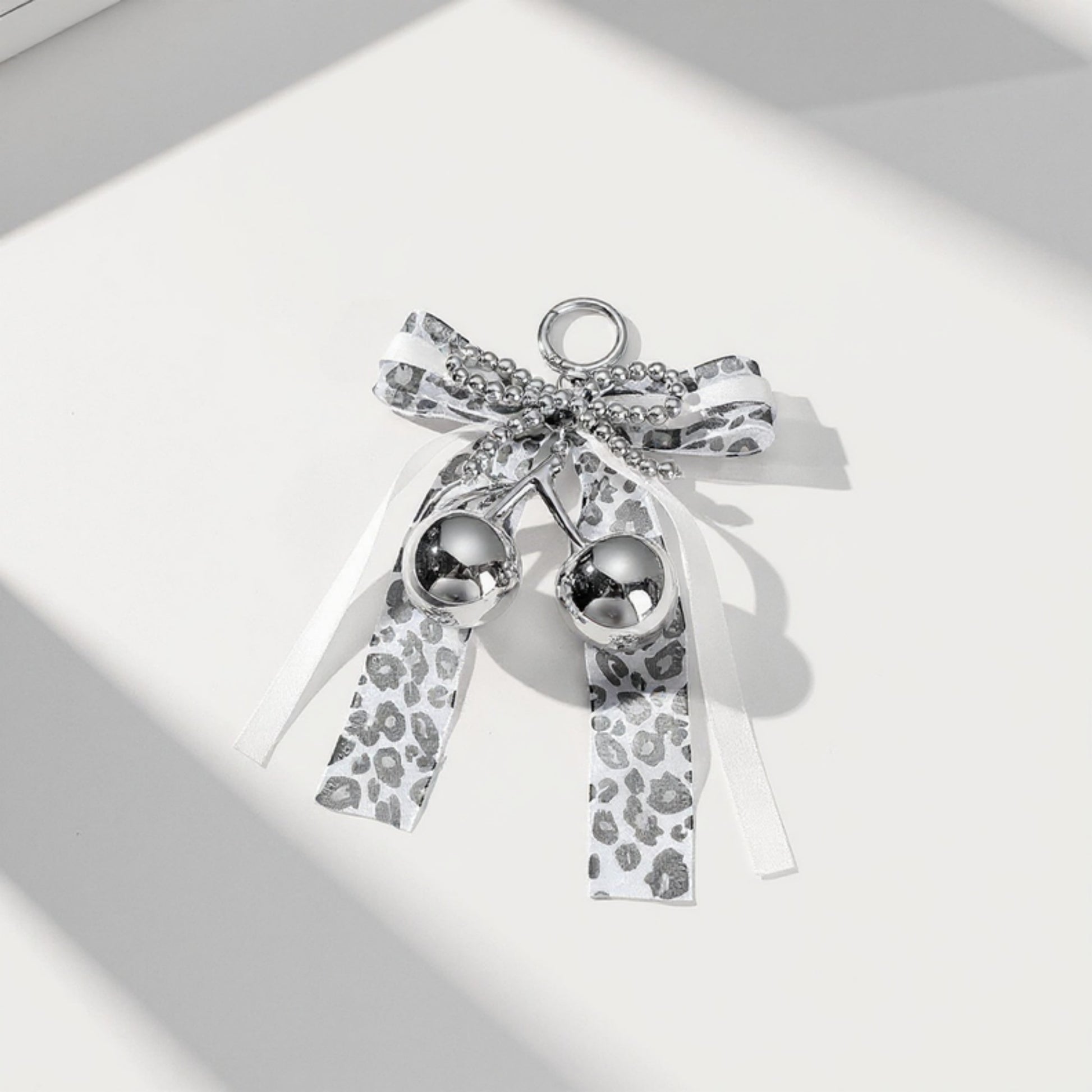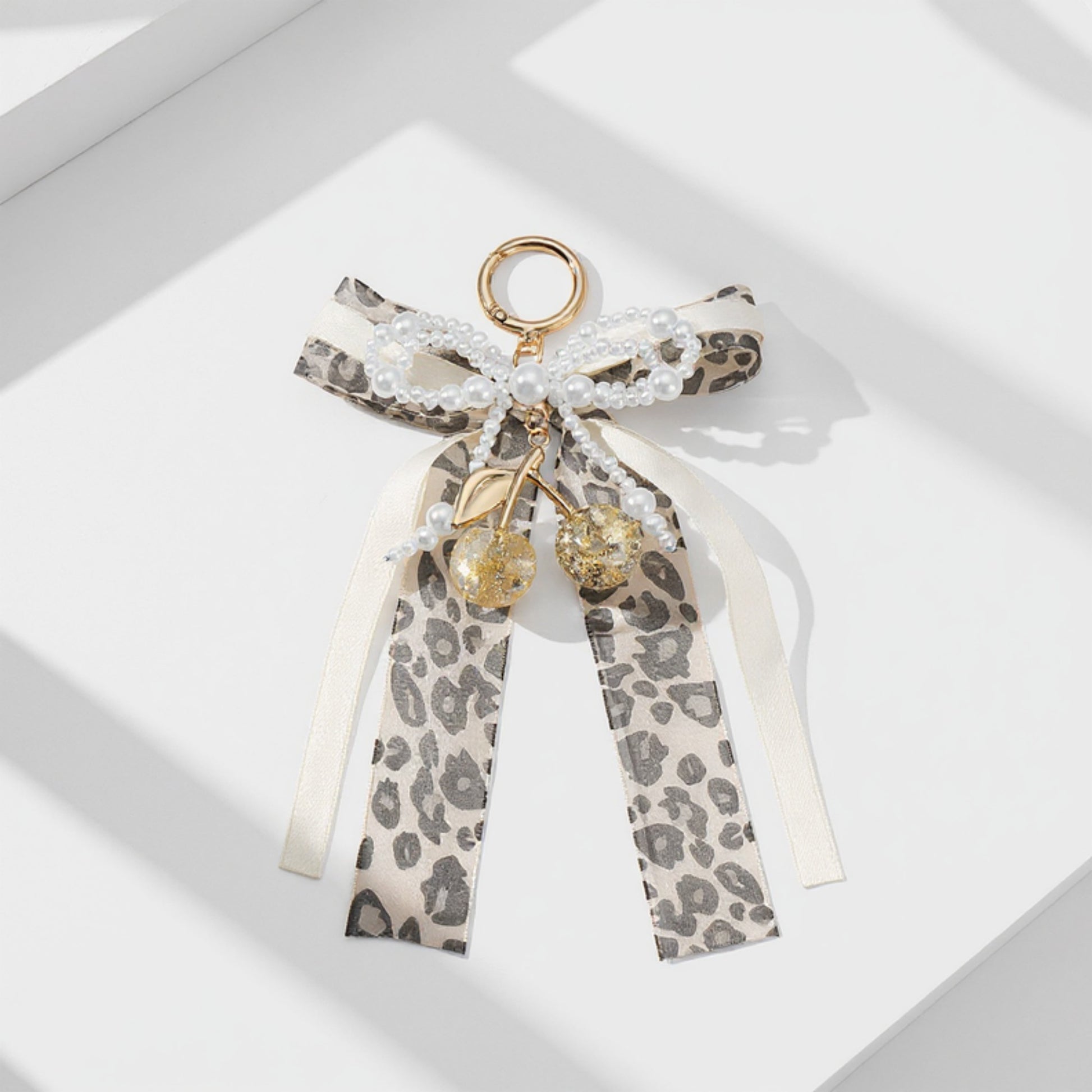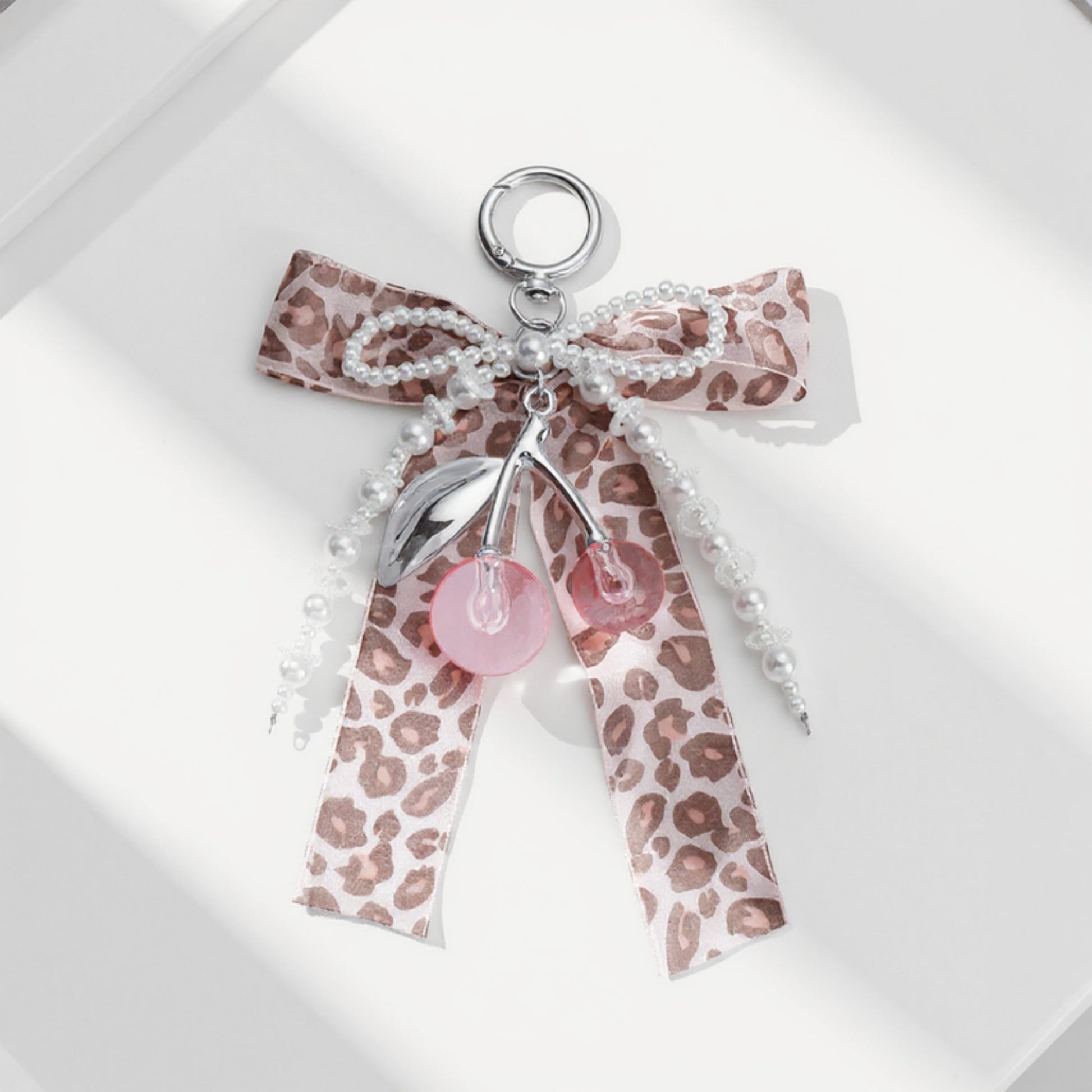 Anna-Kaci Leopard Print Ribbon Keychain with Pearl Bow and Cherry Charms