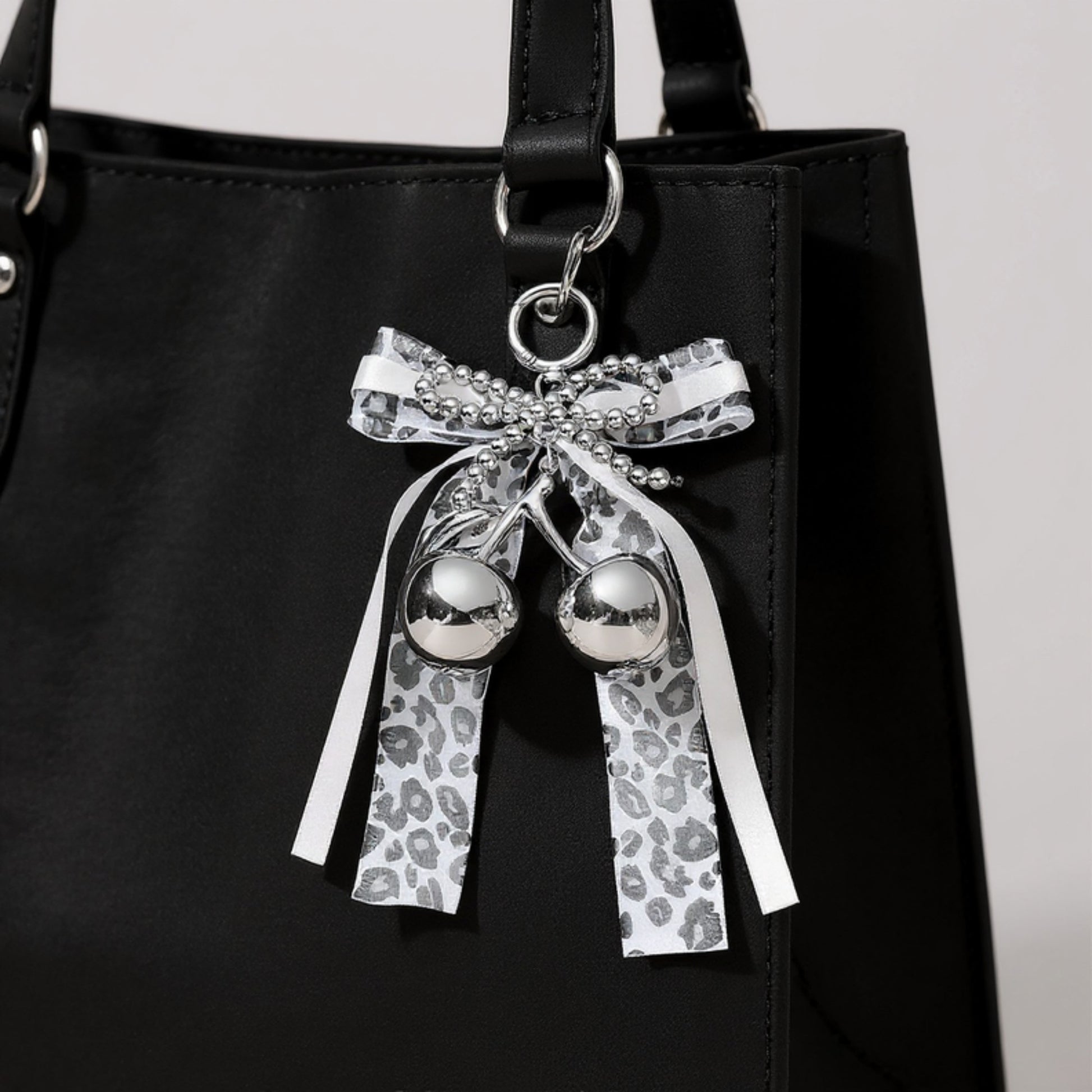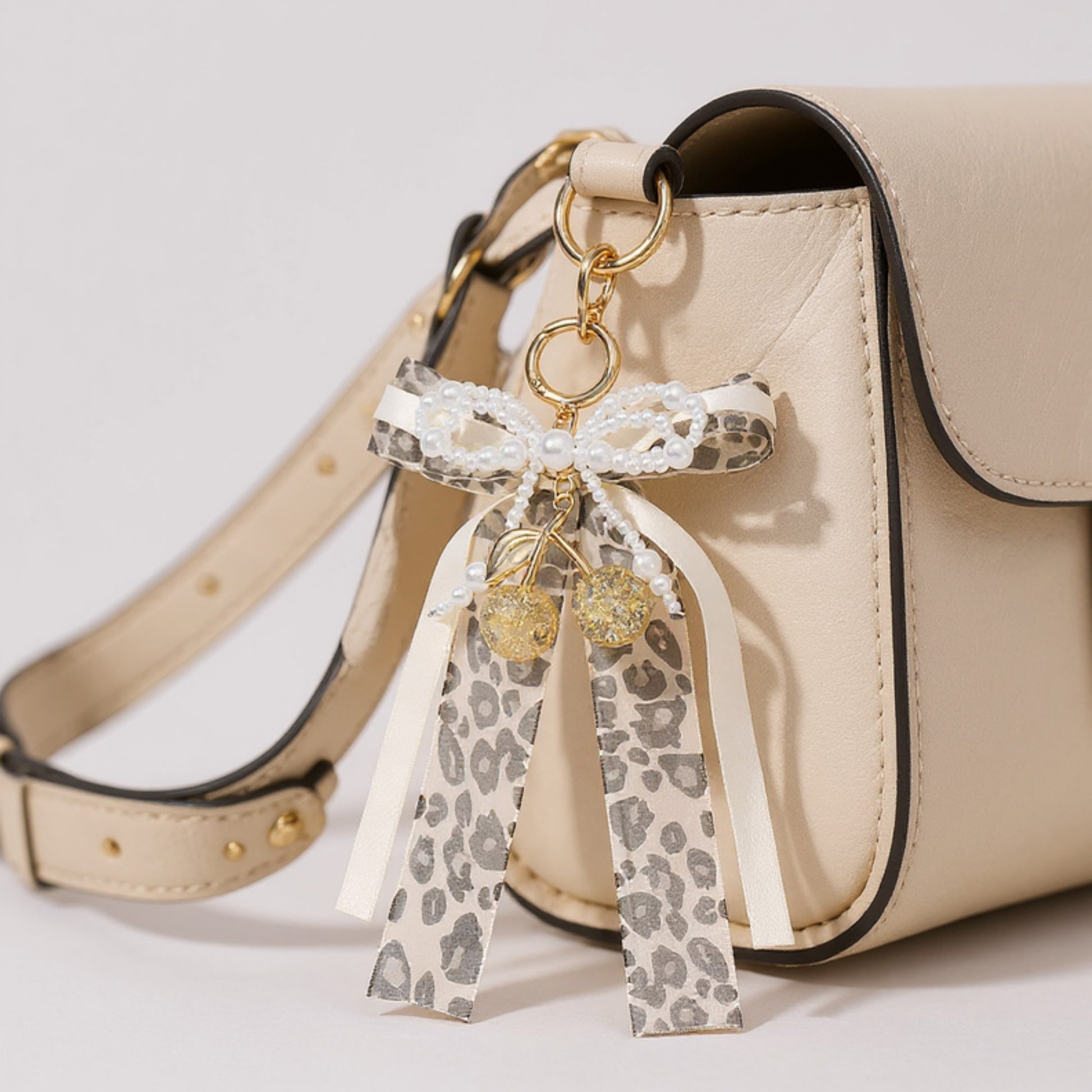 The Anna-Kaci Leopard Print Ribbon Keychain combines bold style with feminine charm. Designed with a satin leopard print ribbon layered with ivory accents, this accessory features a pearl-beaded bow and sparkling golden cherry charms for a playful yet elegant look. Its gold-tone clasp allows easy attachment to handbags, backpacks, or keys, making it both fashionable and functional. Perfect for adding personality and sophistication to your everyday essentials.
