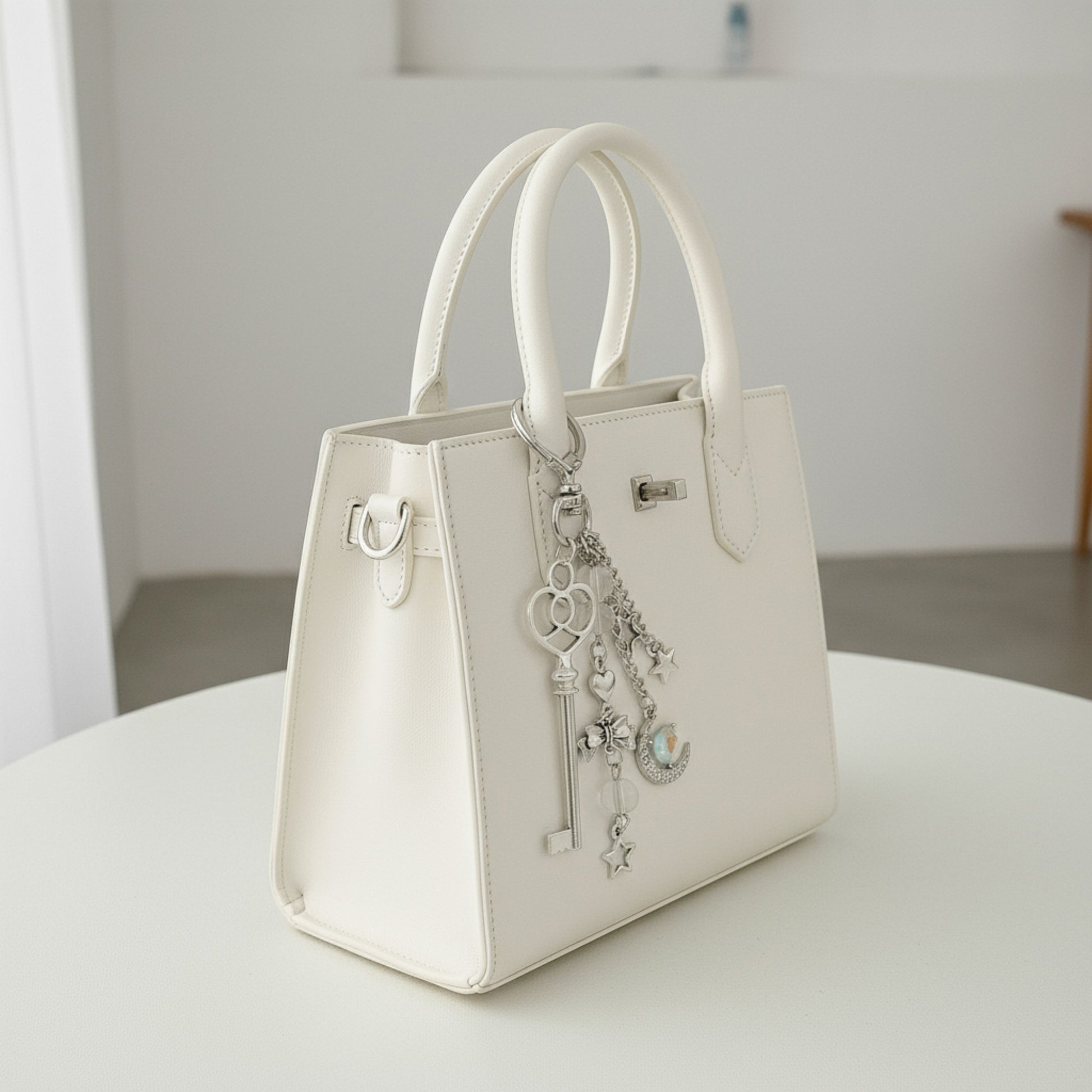 The Anna-Kaci Silver Heart Keychain is a beautifully detailed accessory that captures whimsical charm with celestial and romantic elements. Featuring a delicate heart-shaped clasp, this design includes dangling charms such as a crescent moon, stars, bow, and heart, accented with small glass beads for a soft shimmer. Crafted from polished silver-tone metal, it adds elegance and individuality to any bag, purse, or keyring. Perfect for those who love dreamy, feminine accessories with a touch of sparkle.
