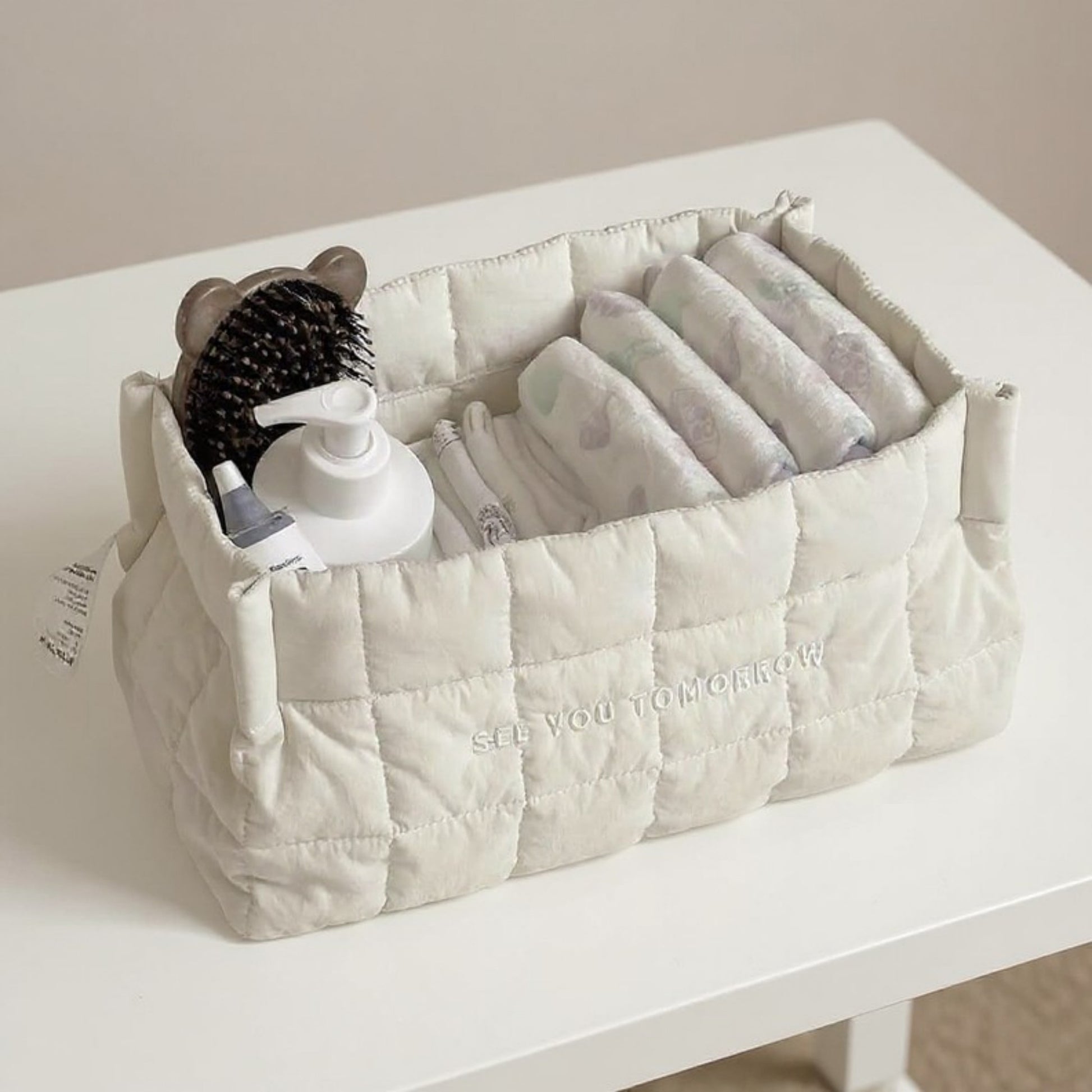 The Anna-Kaci Quilted Storage Basket offers a blend of charm and practicality with its soft padded design and delicate quilted stitching. Embroidered with the phrase ¡°SEE YOU TOMORROW,¡± it brings a cozy, inviting feel to any room. Its structured shape keeps essentials neatly organized, while the fabric texture adds a touch of warmth to your space. Ideal for holding toys, towels, books, or daily necessities, this storage basket doubles as a stylish d¨¦cor piece for bedrooms, nurseries, or living areas.
