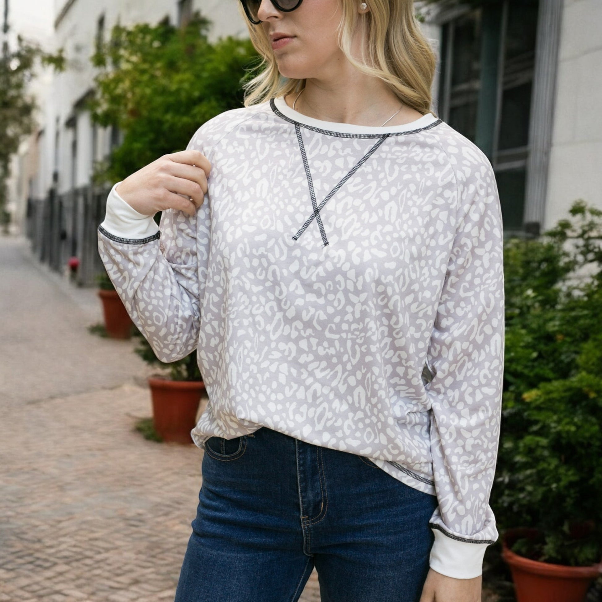 Anna-Kaci Women's Leopard Print Long Sleeve Pullover Top with Ribbed Cuffs and Crew Neckline