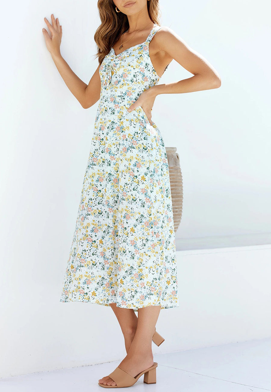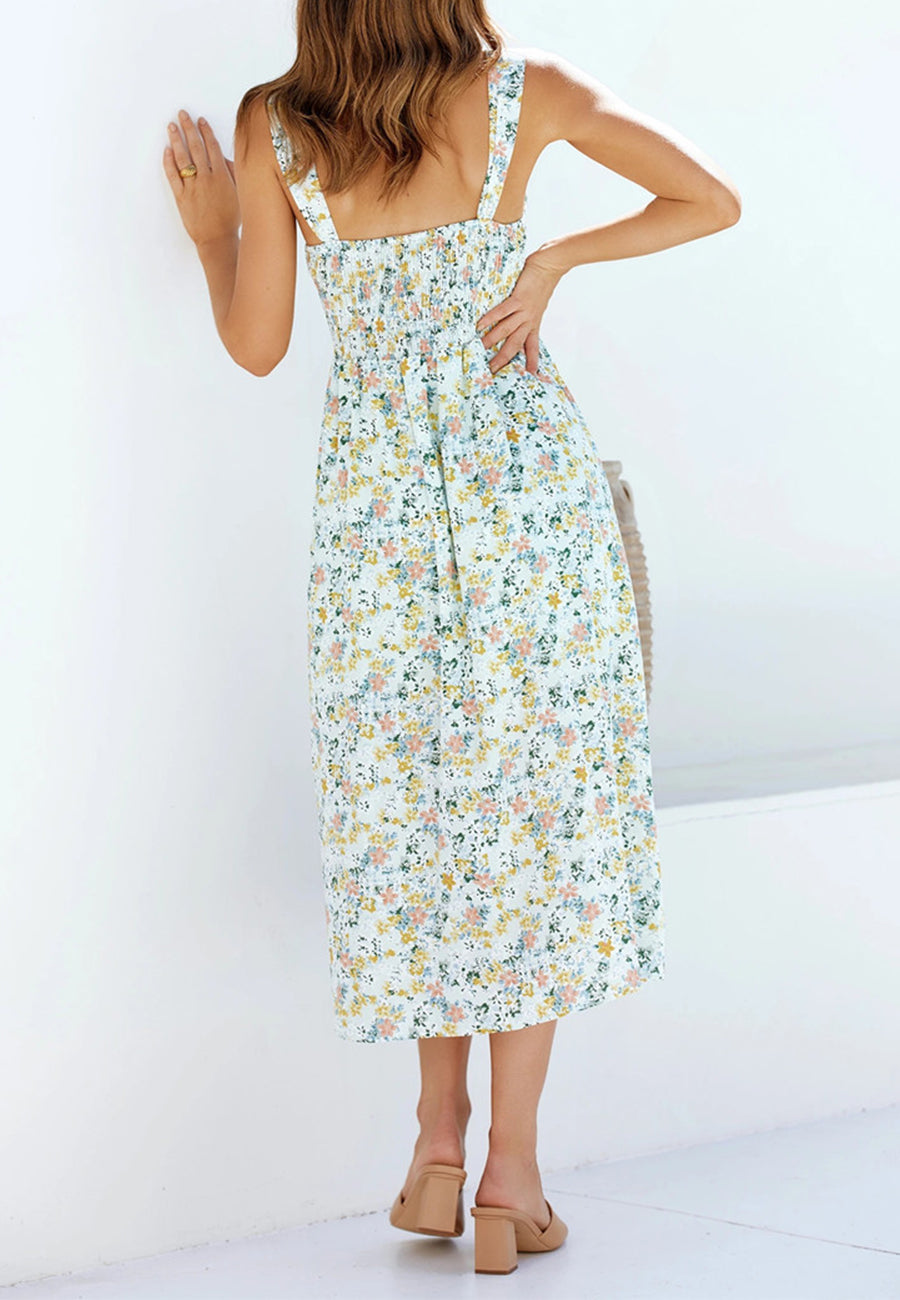 Este vestido veraniego con volantes y estampado floral diminuto es perfecto para vestirte de manera elegante o informal según el día. Este vestido fruncido de verano está diseñado para relajarse todo el día y luego vestirse de manera elegante para salir. Con todos los increíbles colores brillantes, combina este vestido con tus mejores tacones o sandalias y tus accesorios de verano favoritos.