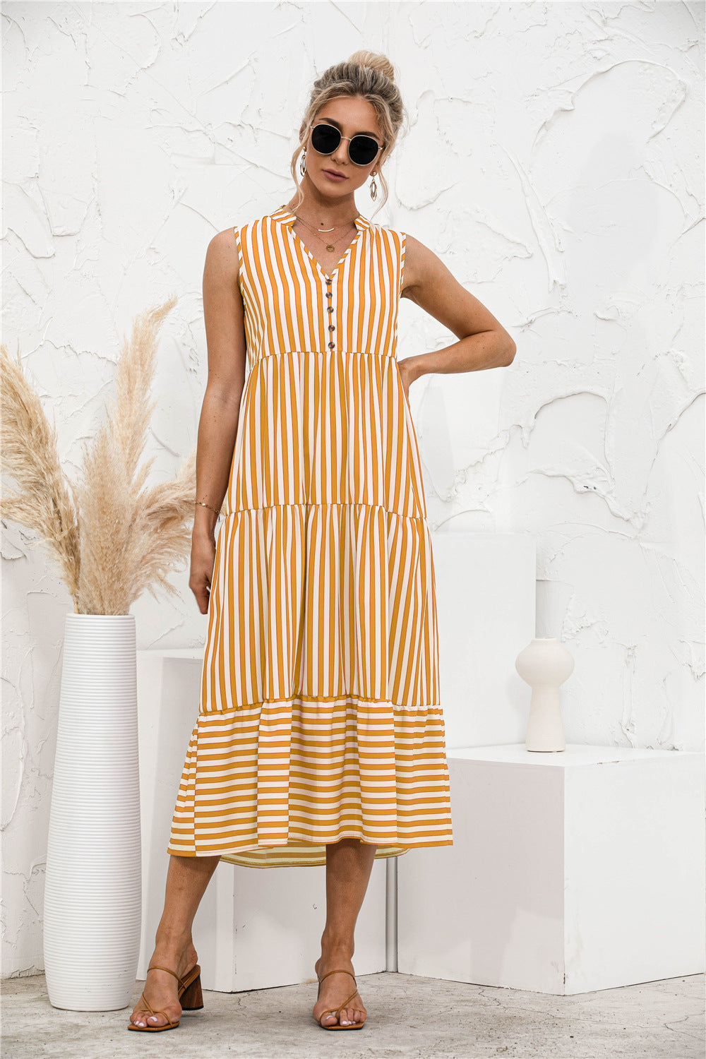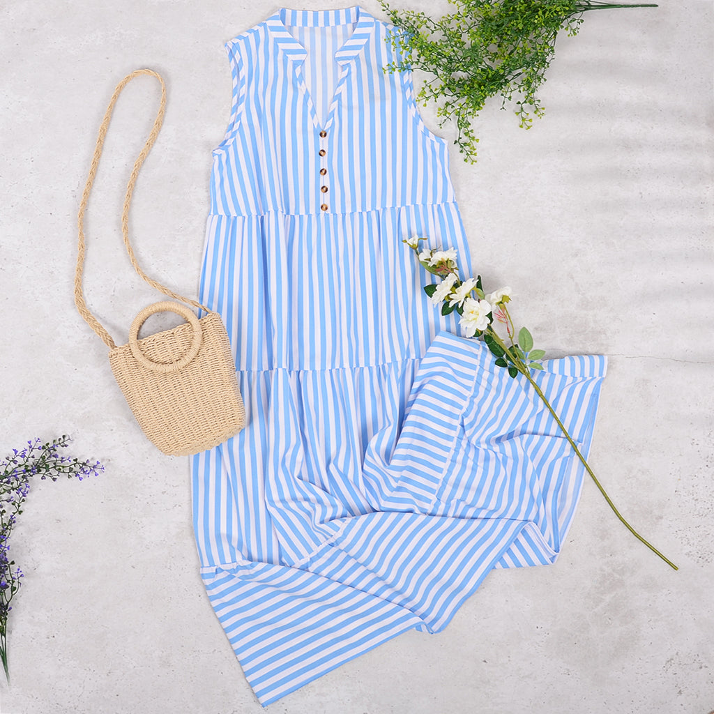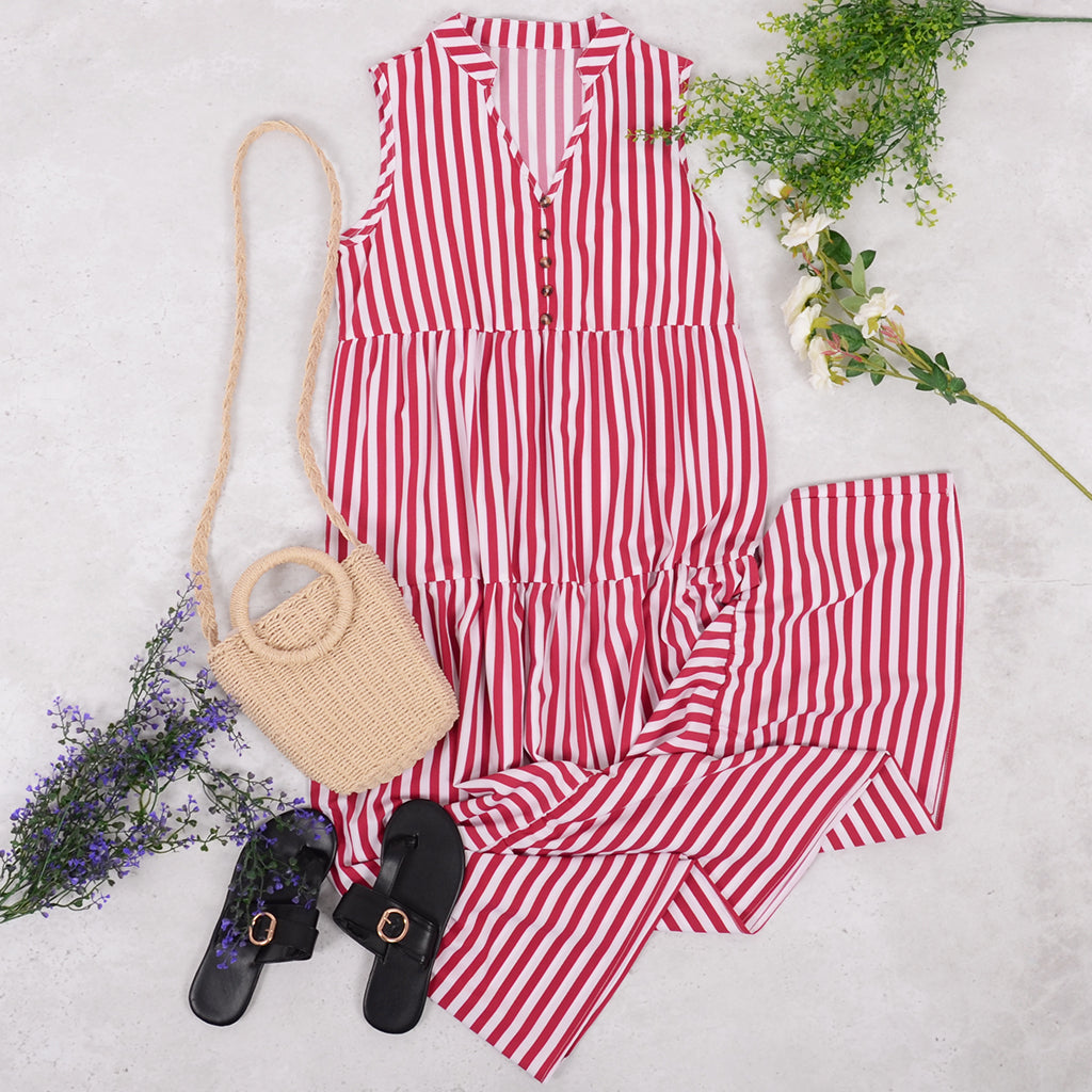 Este vestido largo de verano con volantes, botones y rayas sin mangas es perfecto para vestirte de manera elegante o informal según el día. Con todos los increíbles colores brillantes, combina fácilmente este vestido con tus mejores tacones o sandalias y tus accesorios de verano favoritos. El patrón de rayas hace que sea fácil de combinar con muchos accesorios y las rayas en diferentes direcciones brindan un aspecto estilizador. ¡Te verás increíble de todas formas!