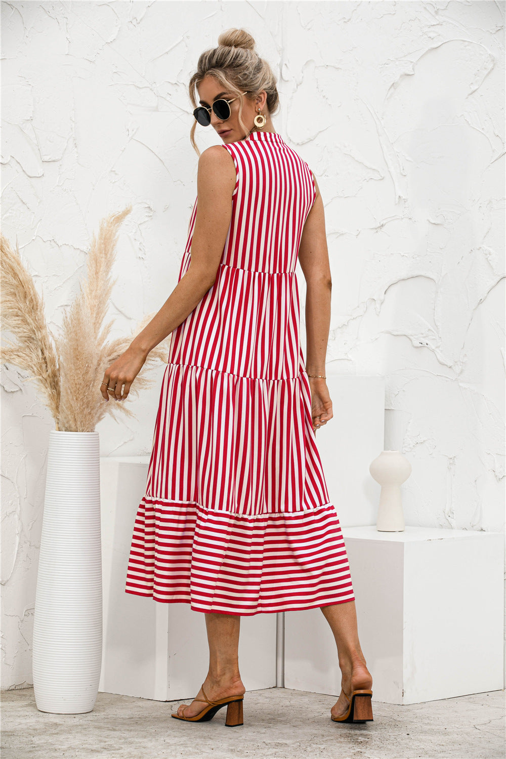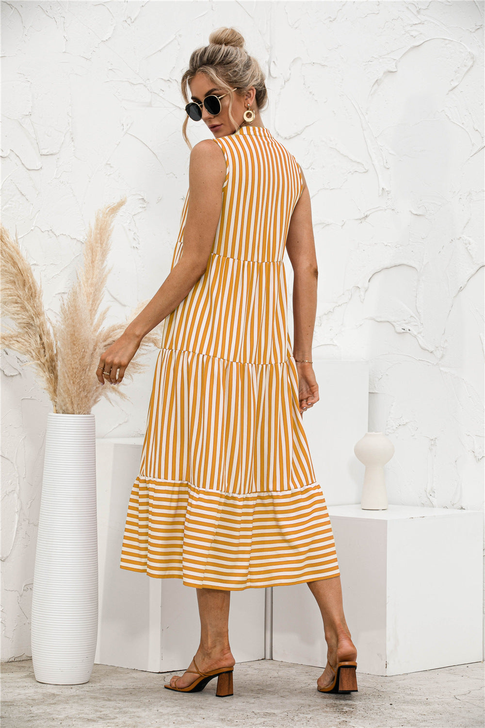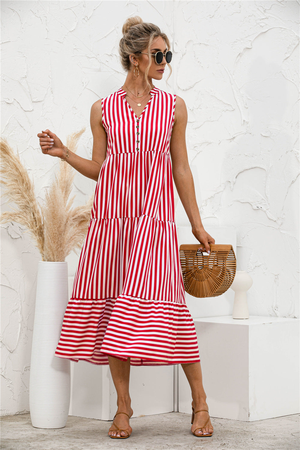 Este vestido largo de verano con volantes, botones y rayas sin mangas es perfecto para vestirte de manera elegante o informal según el día. Con todos los increíbles colores brillantes, combina fácilmente este vestido con tus mejores tacones o sandalias y tus accesorios de verano favoritos. El patrón de rayas hace que sea fácil de combinar con muchos accesorios y las rayas en diferentes direcciones brindan un aspecto estilizador. ¡Te verás increíble de todas formas!
