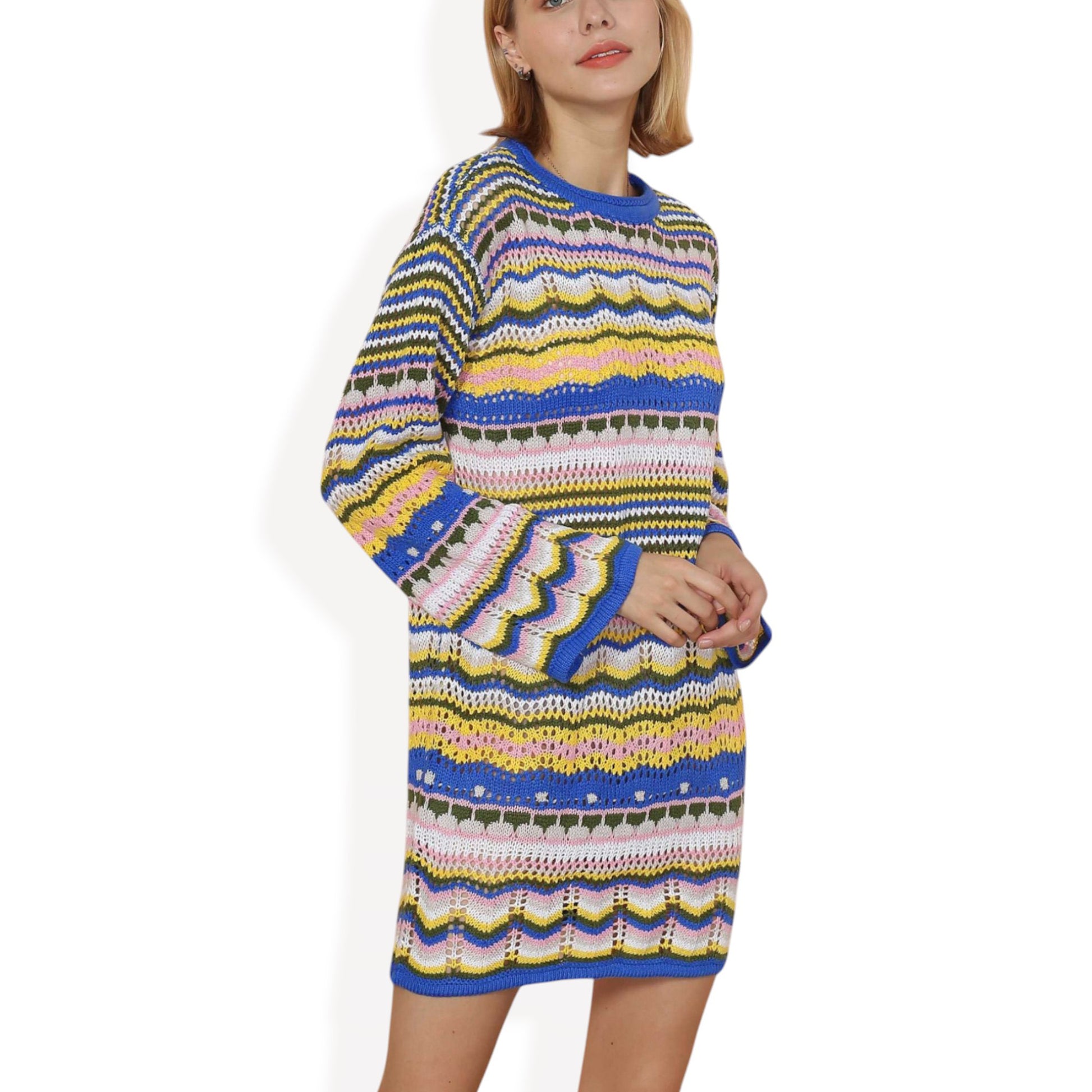 Anna-Kaci Women's Long Sleeve Knit Sweater Dress with Colorful Striped Pattern and Relaxed Fit