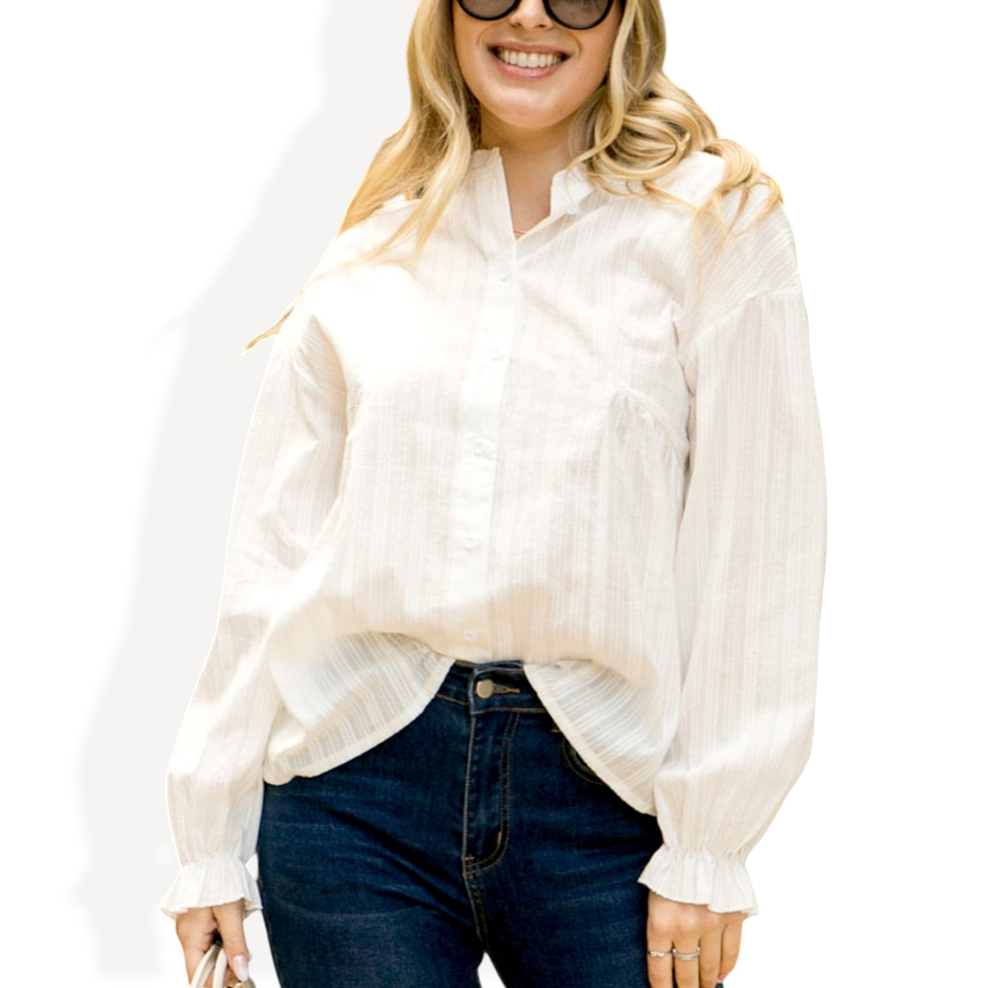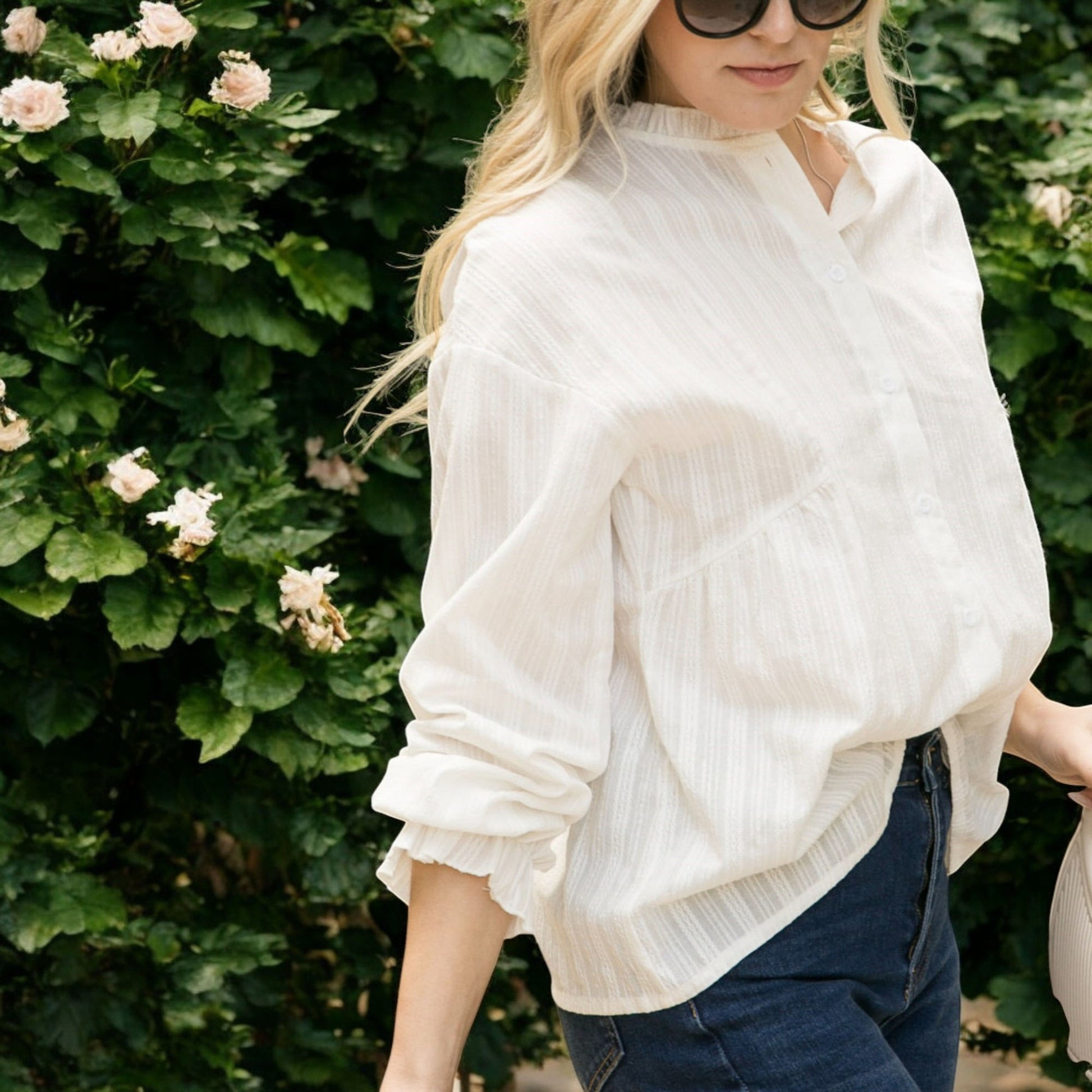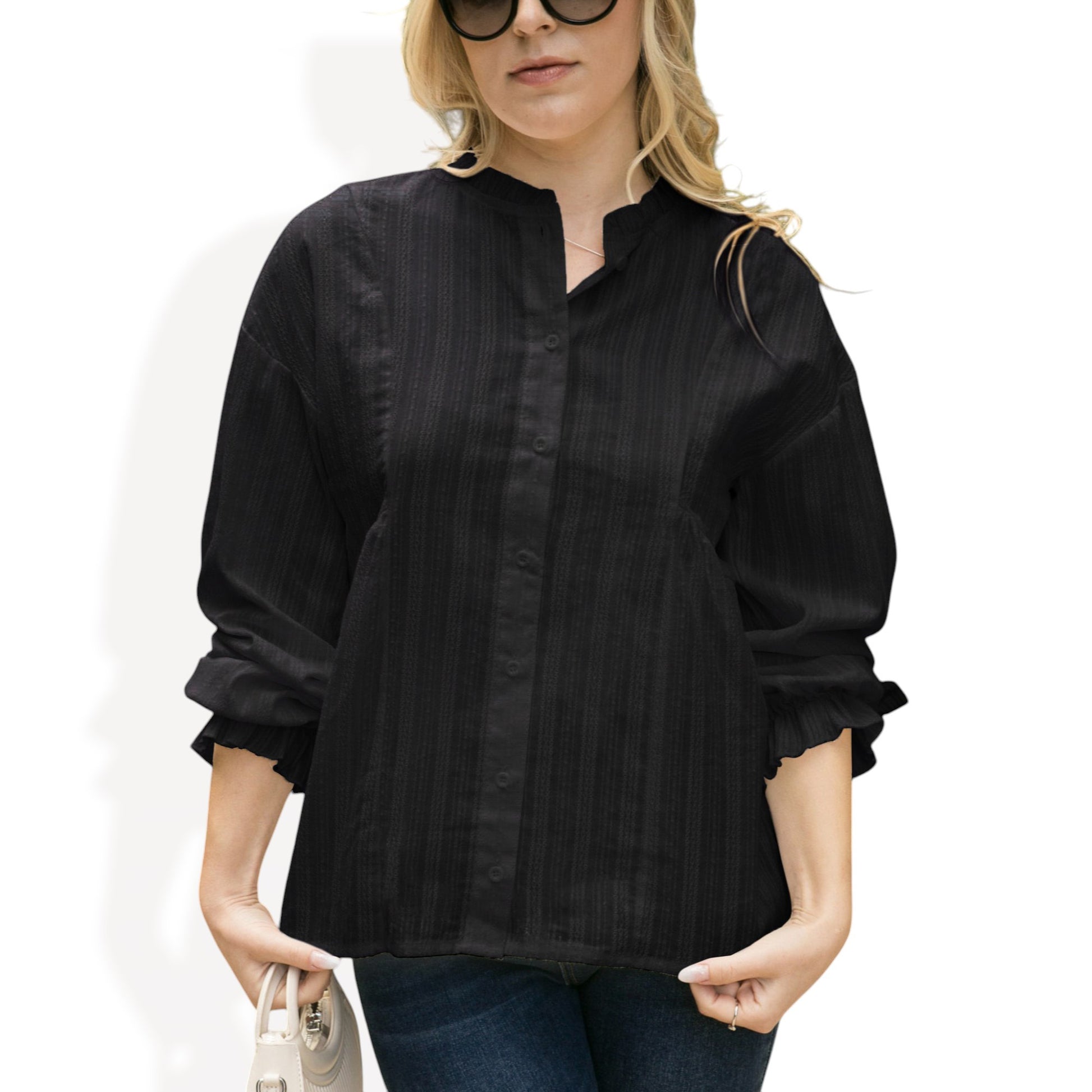 The Anna-Kaci Women's Long Sleeve Button Down Blouse is designed with a modern band collar and relaxed silhouette for a timeless look. Featuring a button-down front and long sleeves with gathered cuffs, this blouse blends style and comfort seamlessly. The subtle vertical textured stripe adds depth and sophistication, while the lightweight woven fabric ensures ease of wear. Perfect for pairing with jeans, skirts, or trousers, this blouse offers effortless elegance and versatility.