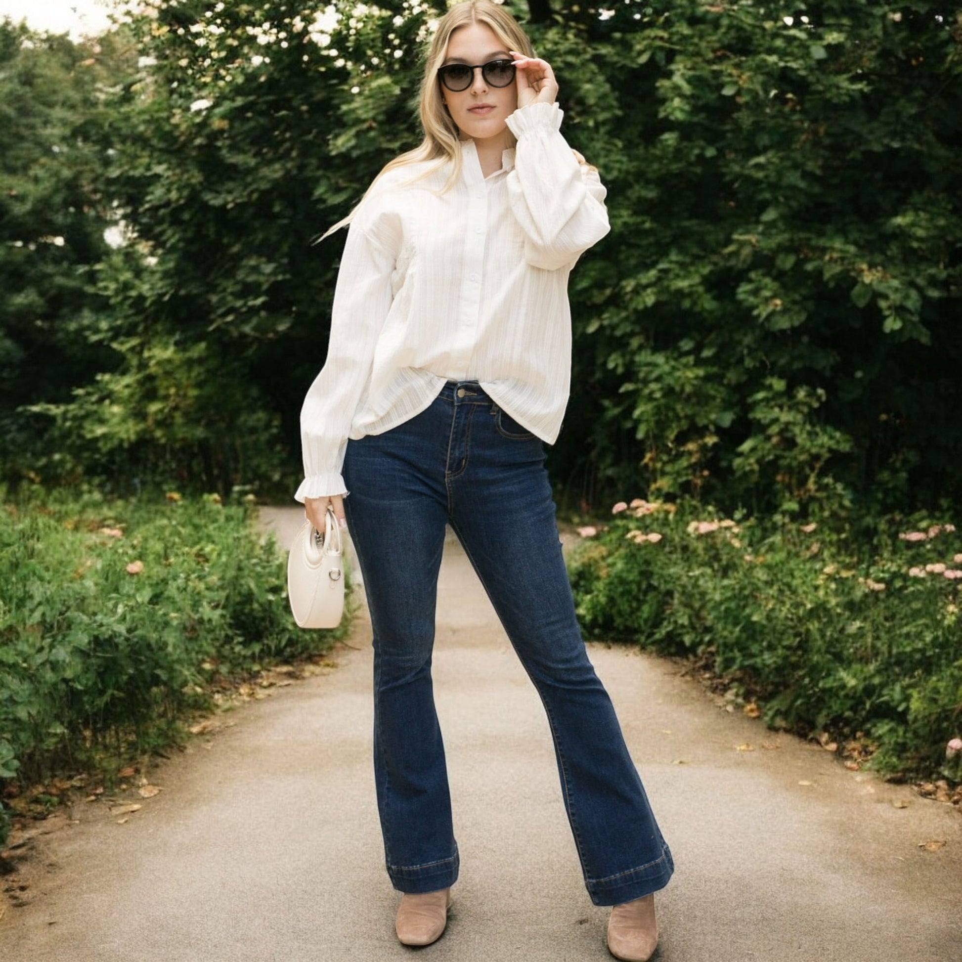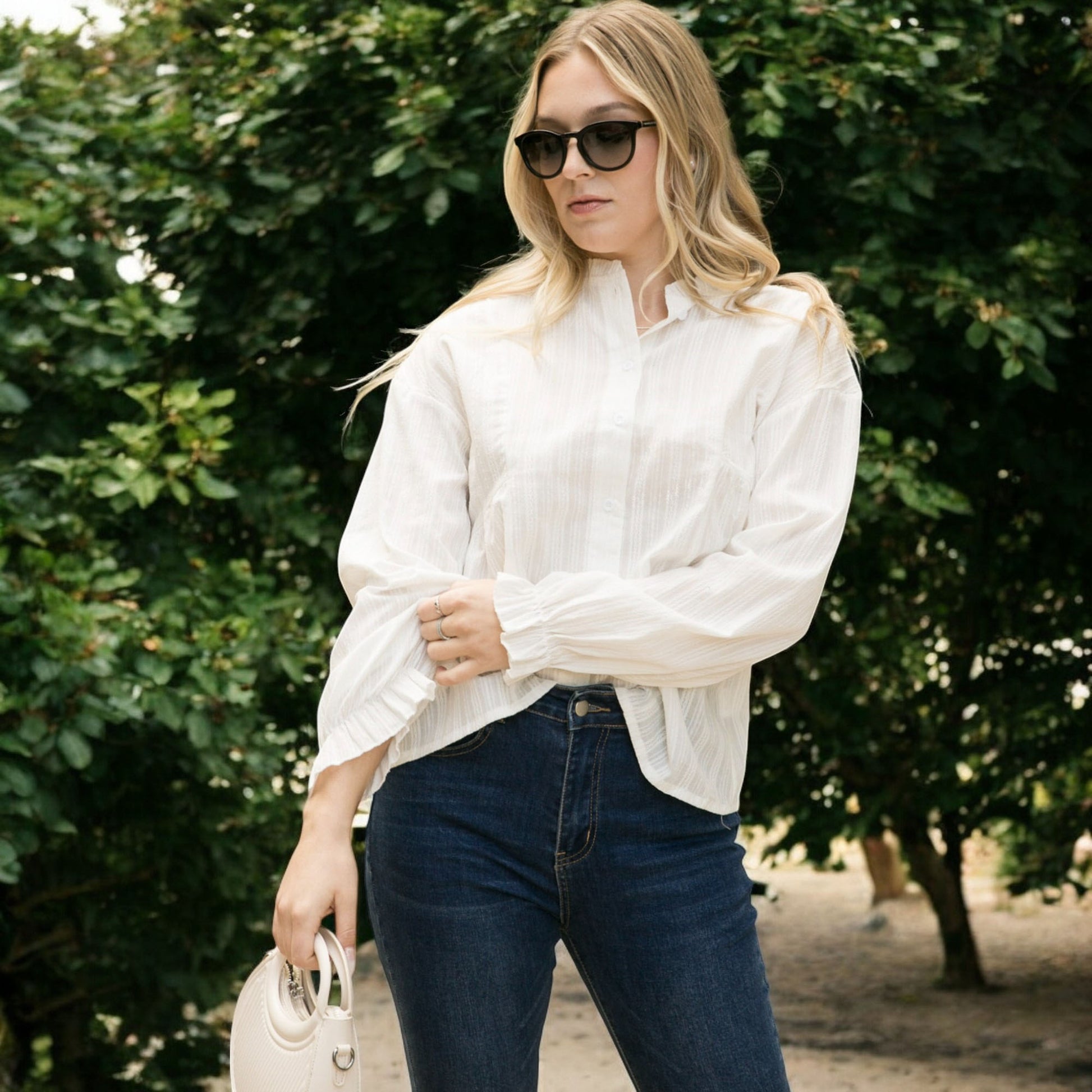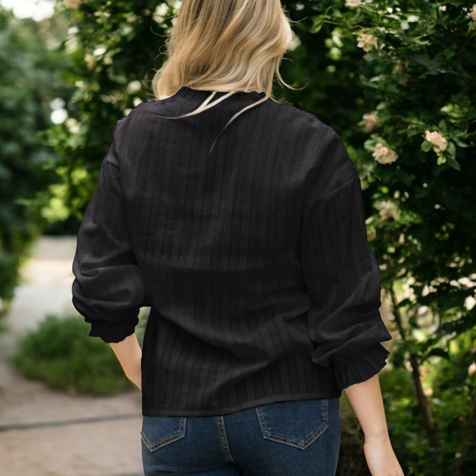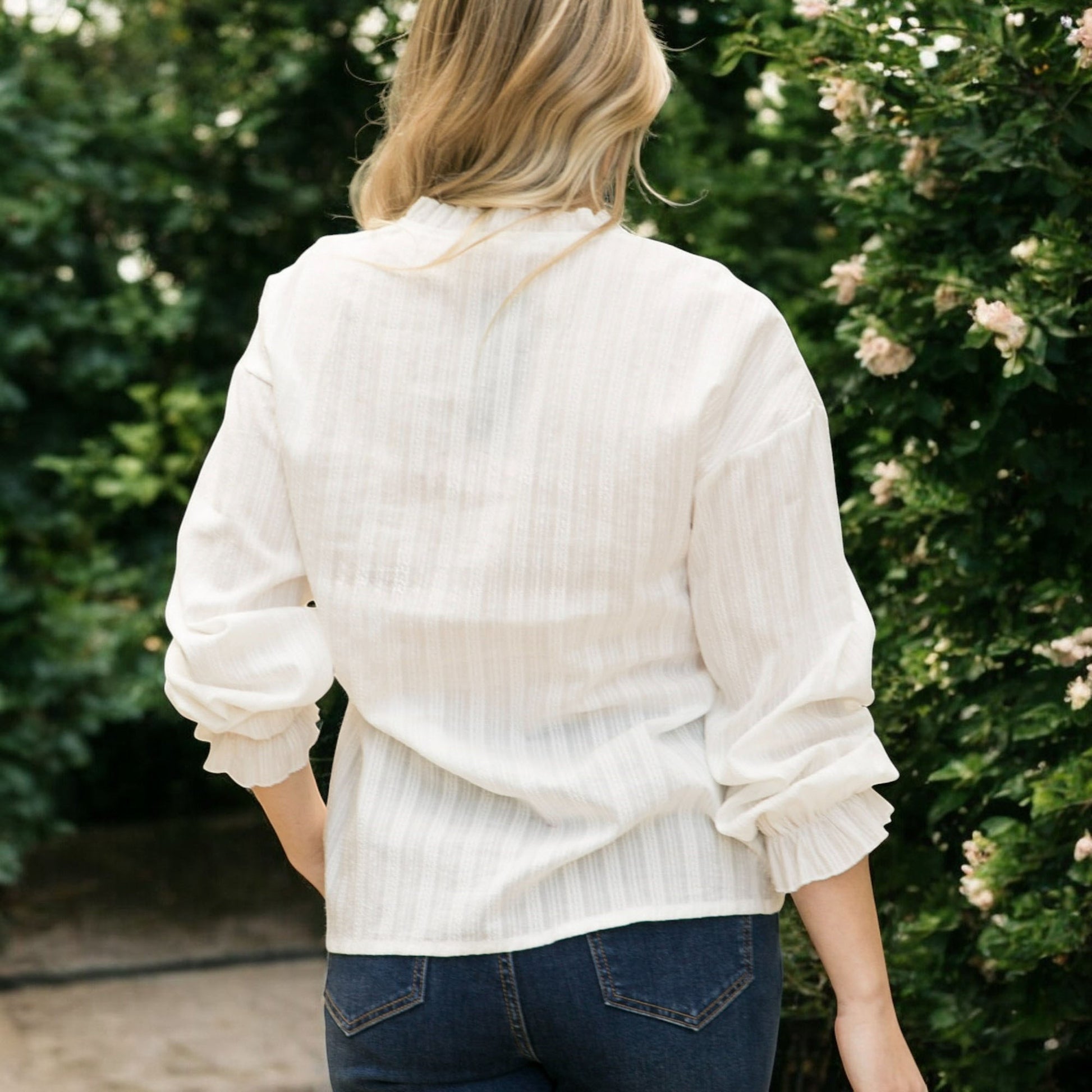 The Anna-Kaci Women's Long Sleeve Button Down Blouse is designed with a modern band collar and relaxed silhouette for a timeless look. Featuring a button-down front and long sleeves with gathered cuffs, this blouse blends style and comfort seamlessly. The subtle vertical textured stripe adds depth and sophistication, while the lightweight woven fabric ensures ease of wear. Perfect for pairing with jeans, skirts, or trousers, this blouse offers effortless elegance and versatility.