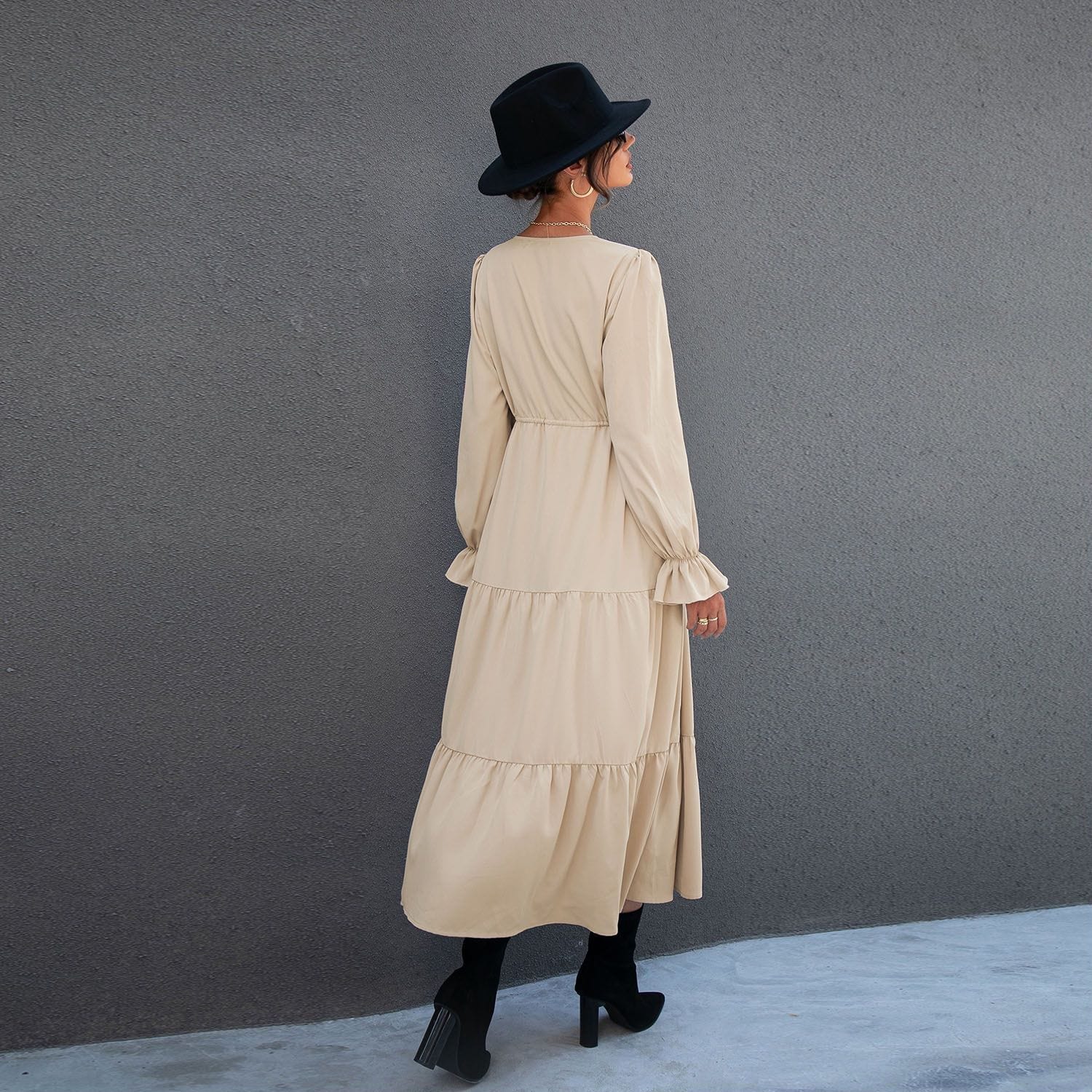 El vestido Anna-Kaci tiene una hermosa falda escalonada. Tiene escote en V, mangas largas, silueta en forma de A, lazo en la cintura y largo hasta la mitad de la pantorrilla. Combínalo con un sombrero negro y botas negras para lograr un look radiante.