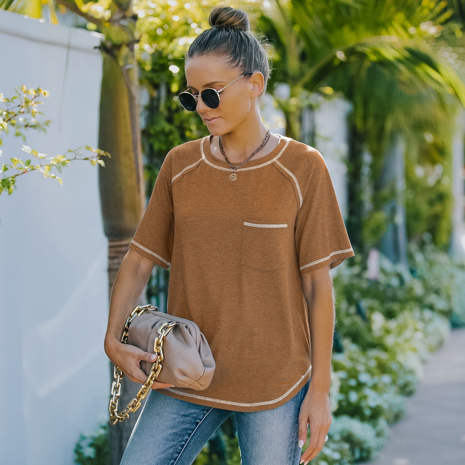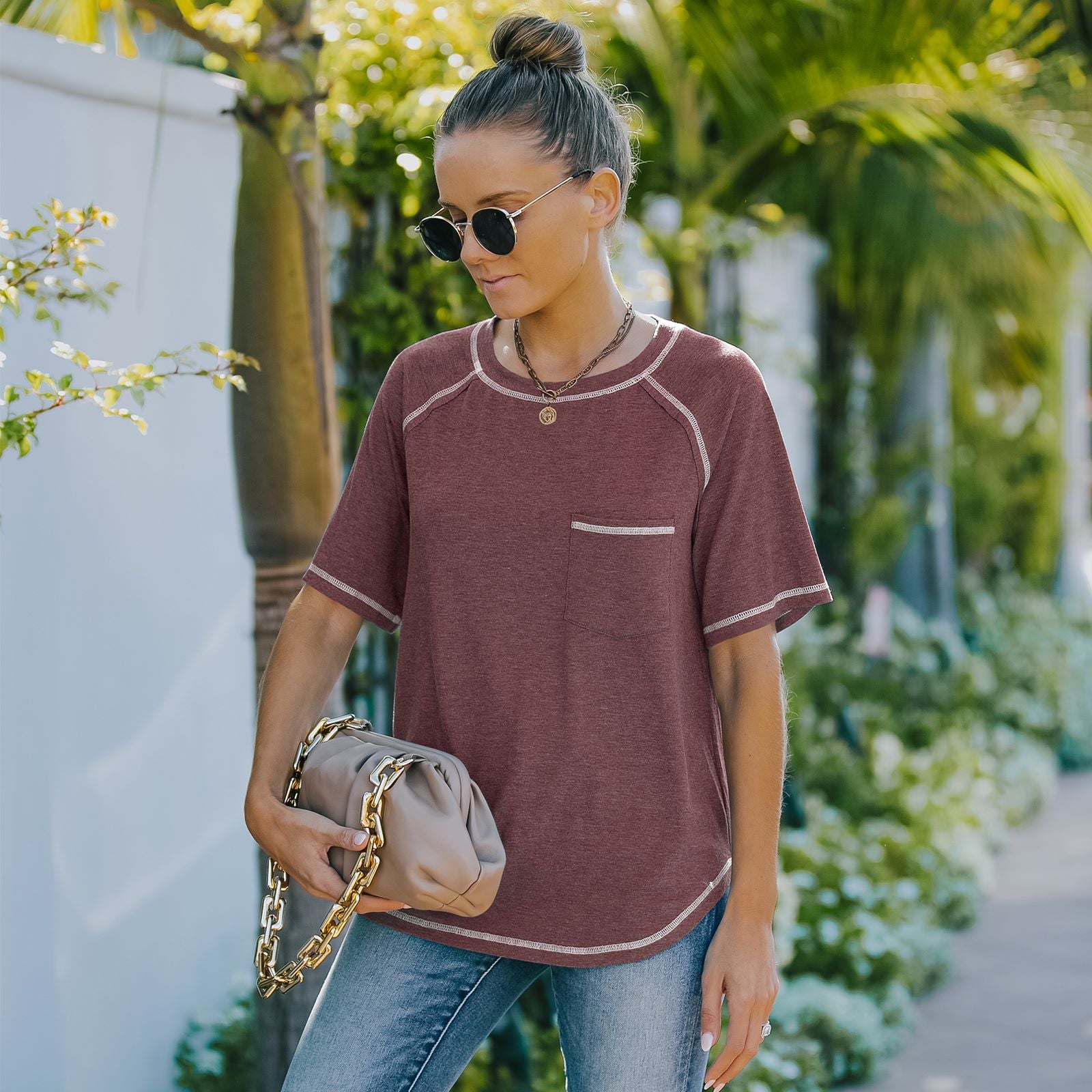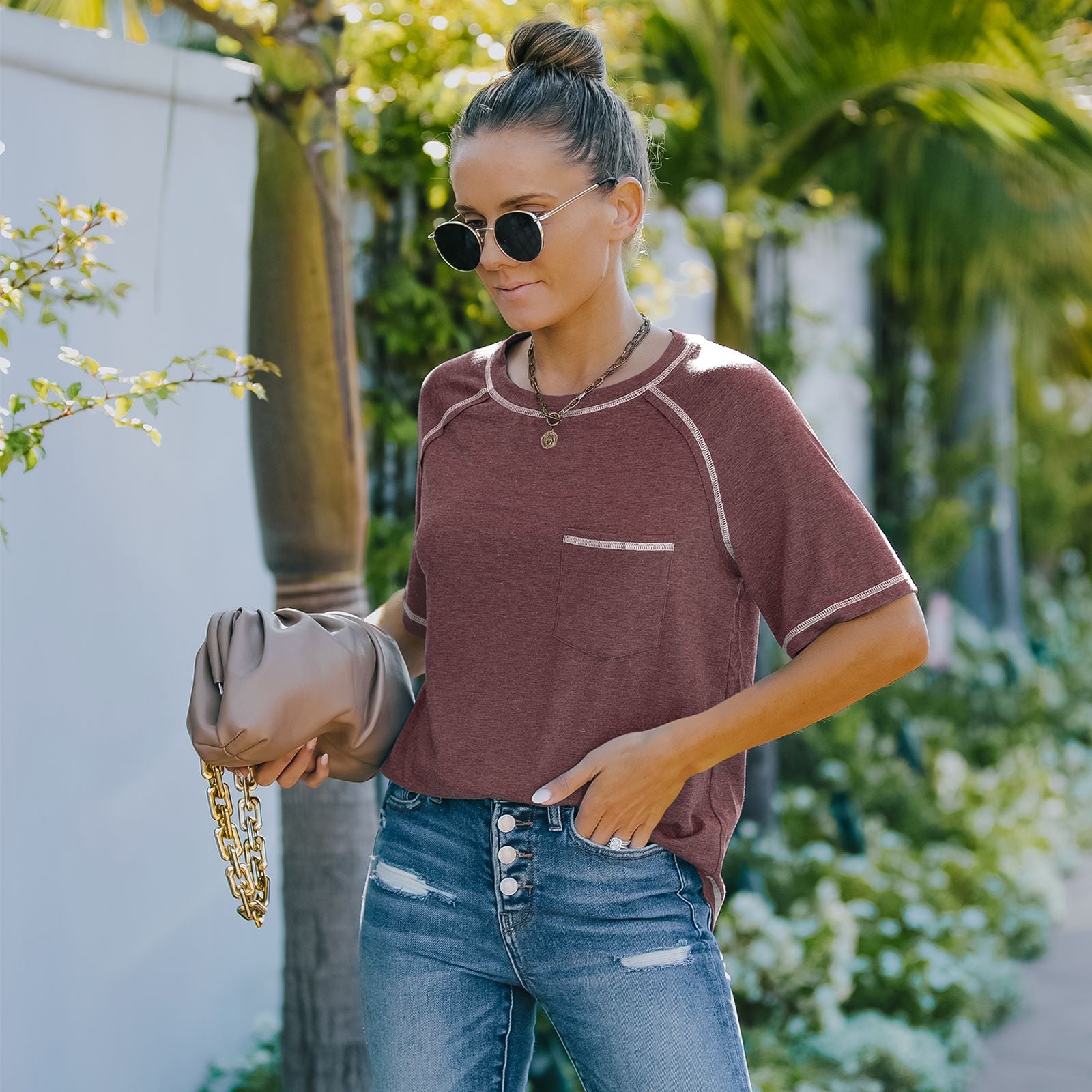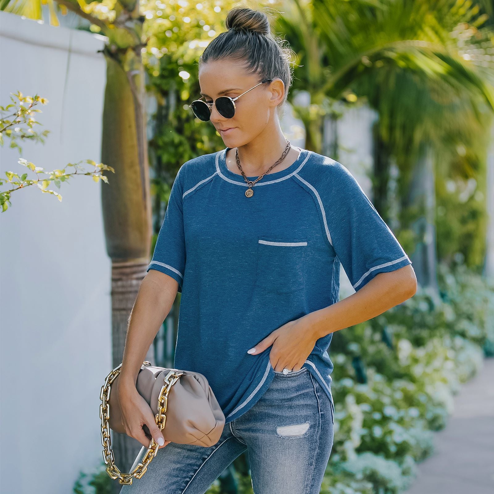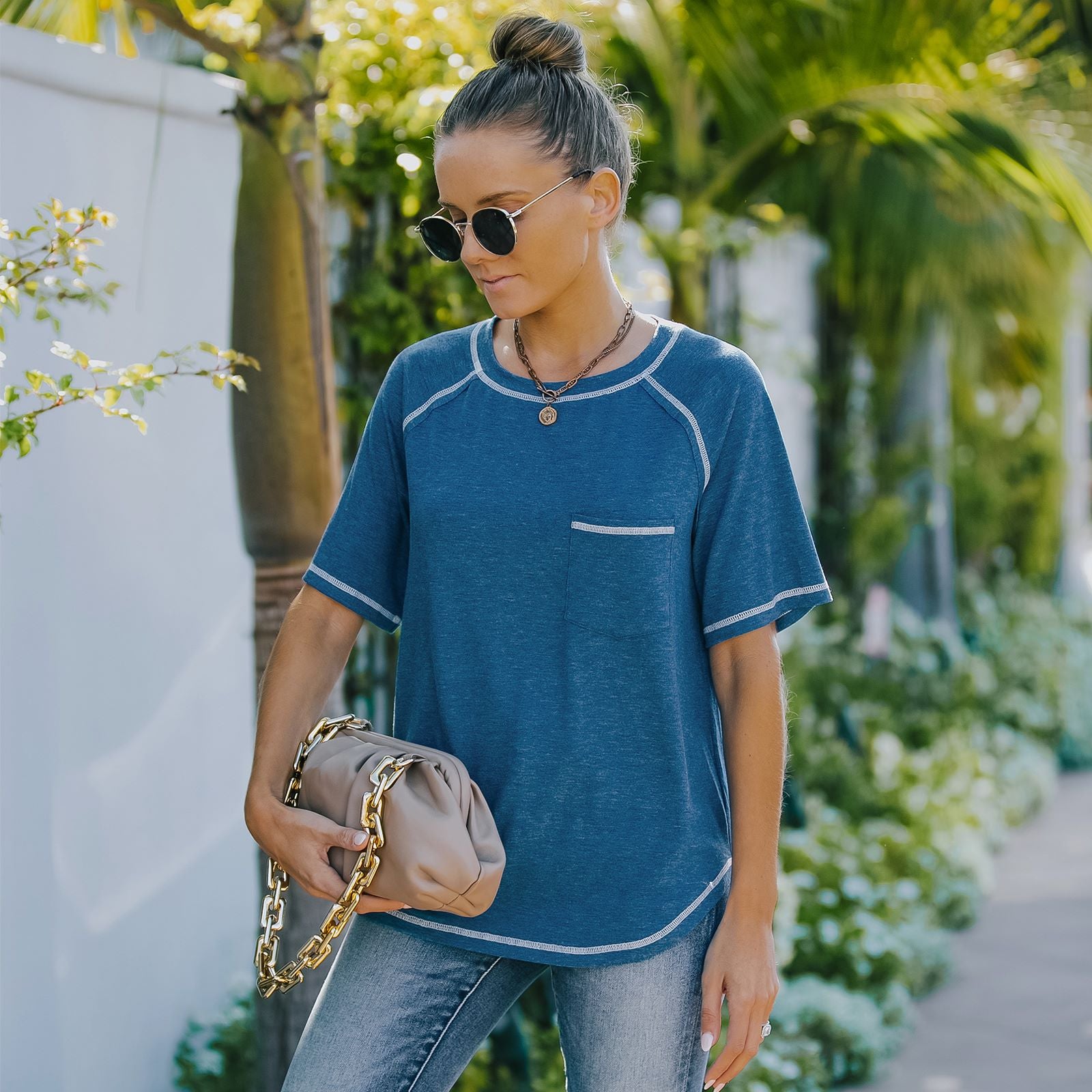 Camiseta básica de verano con cuello redondo, manga corta y bolsillo en el pecho