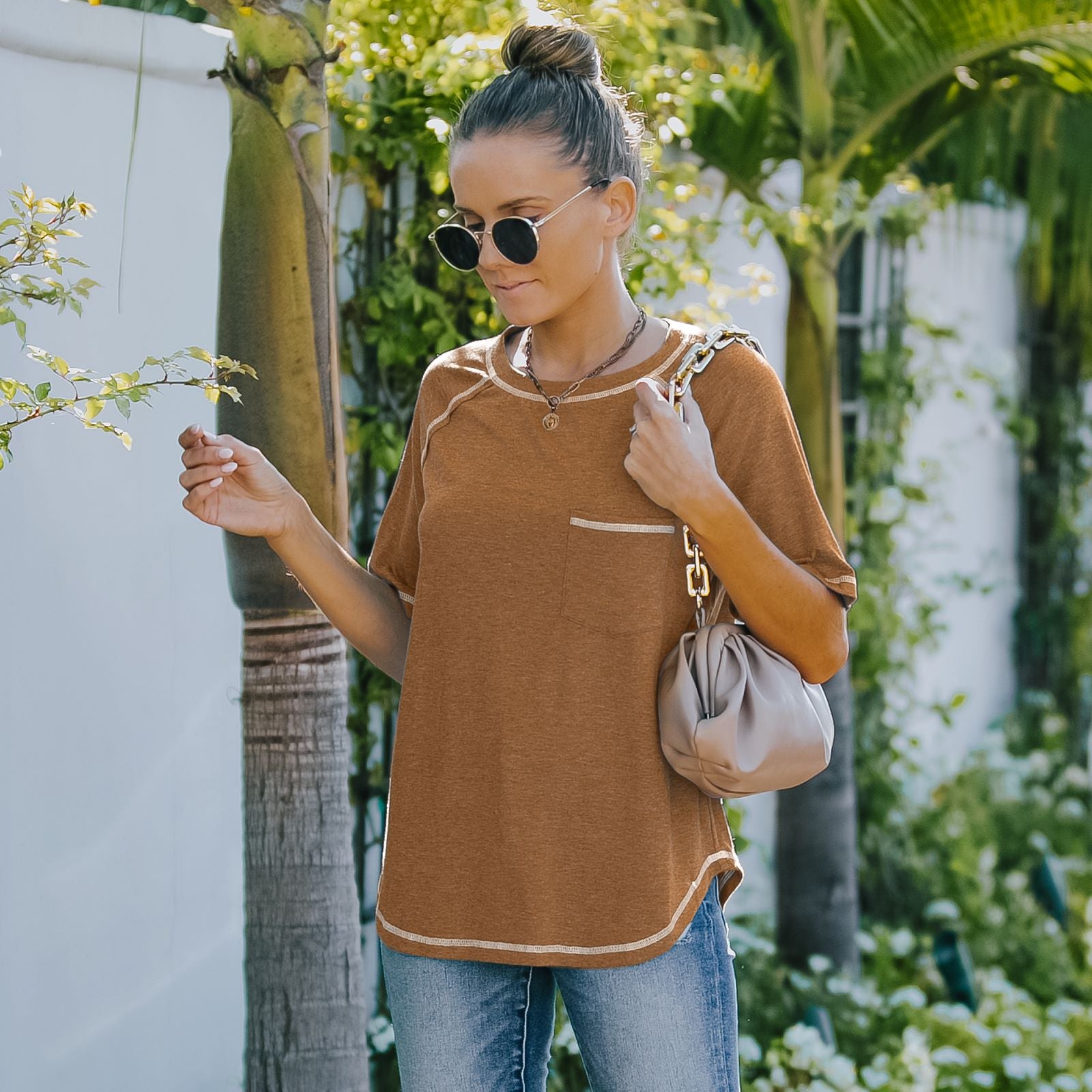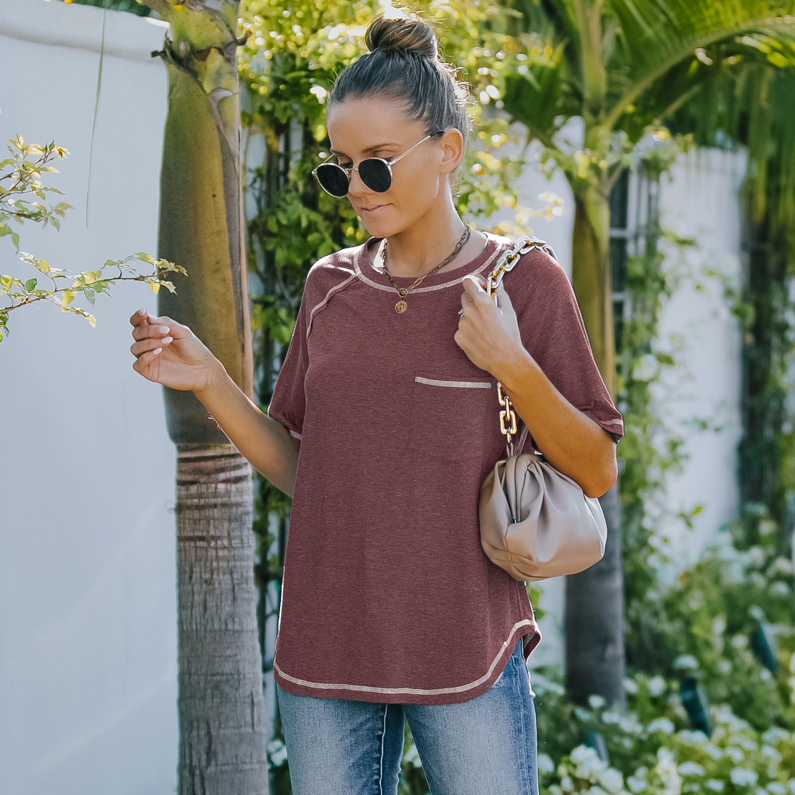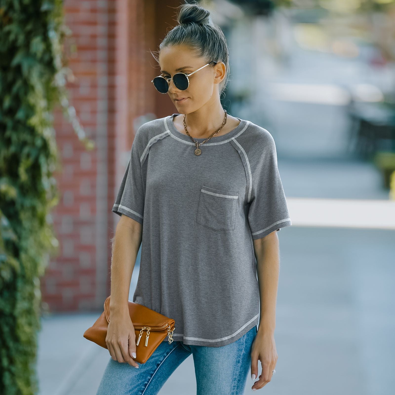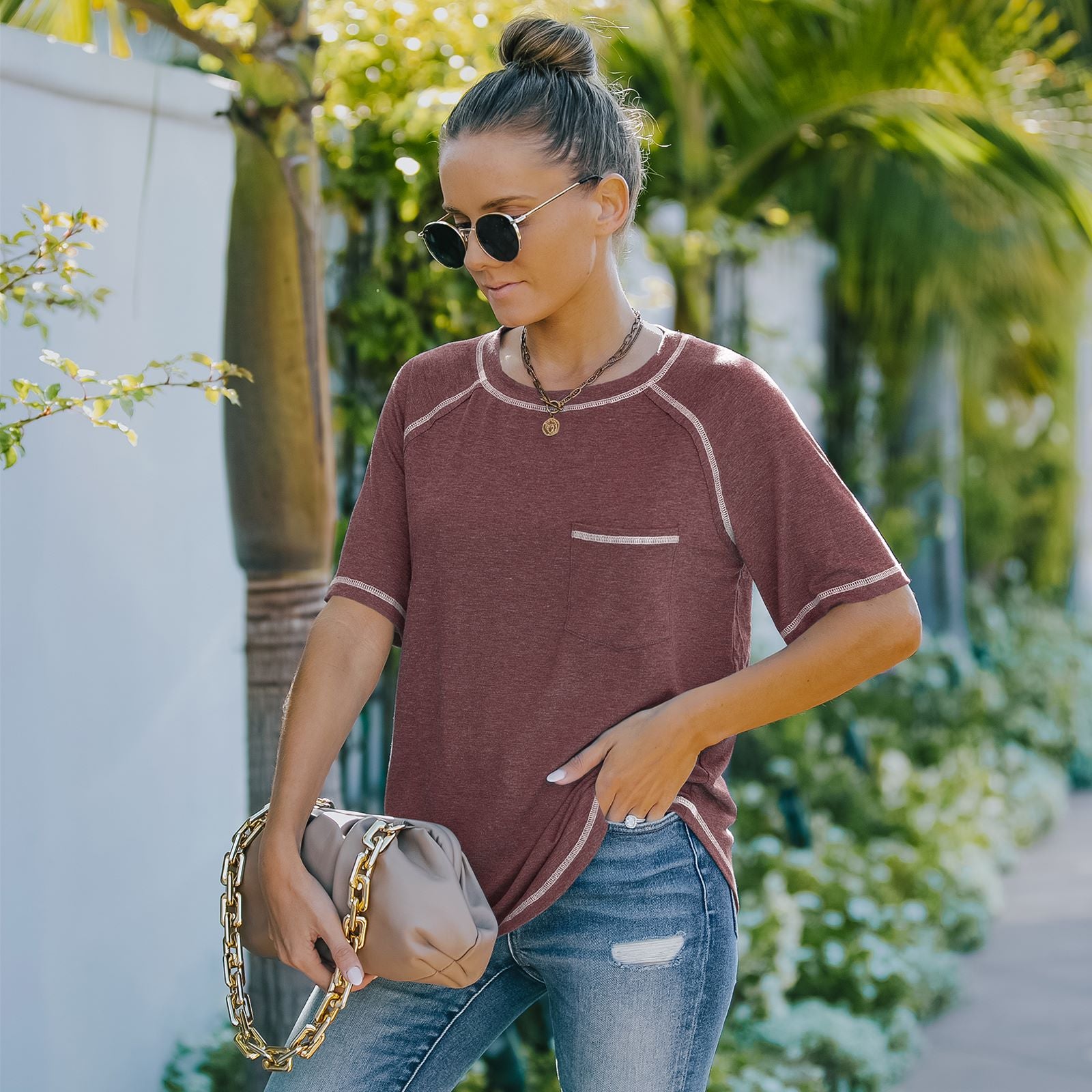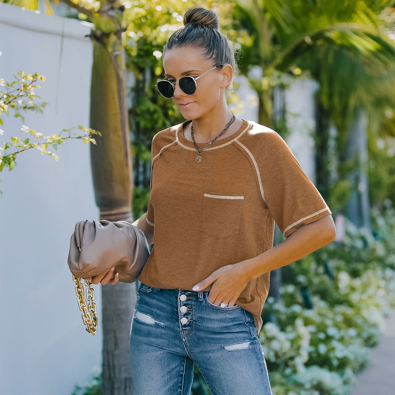 Camiseta básica de verano con cuello redondo, manga corta y bolsillo en el pecho