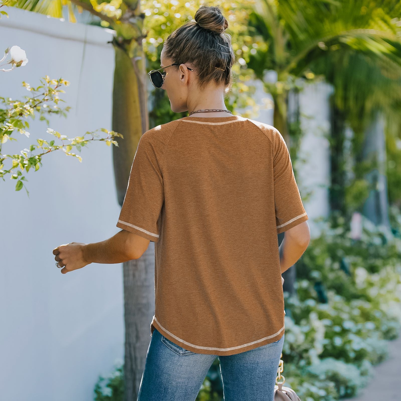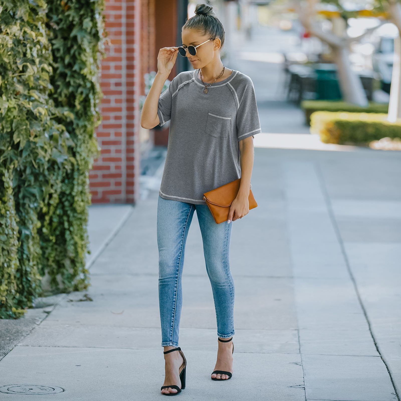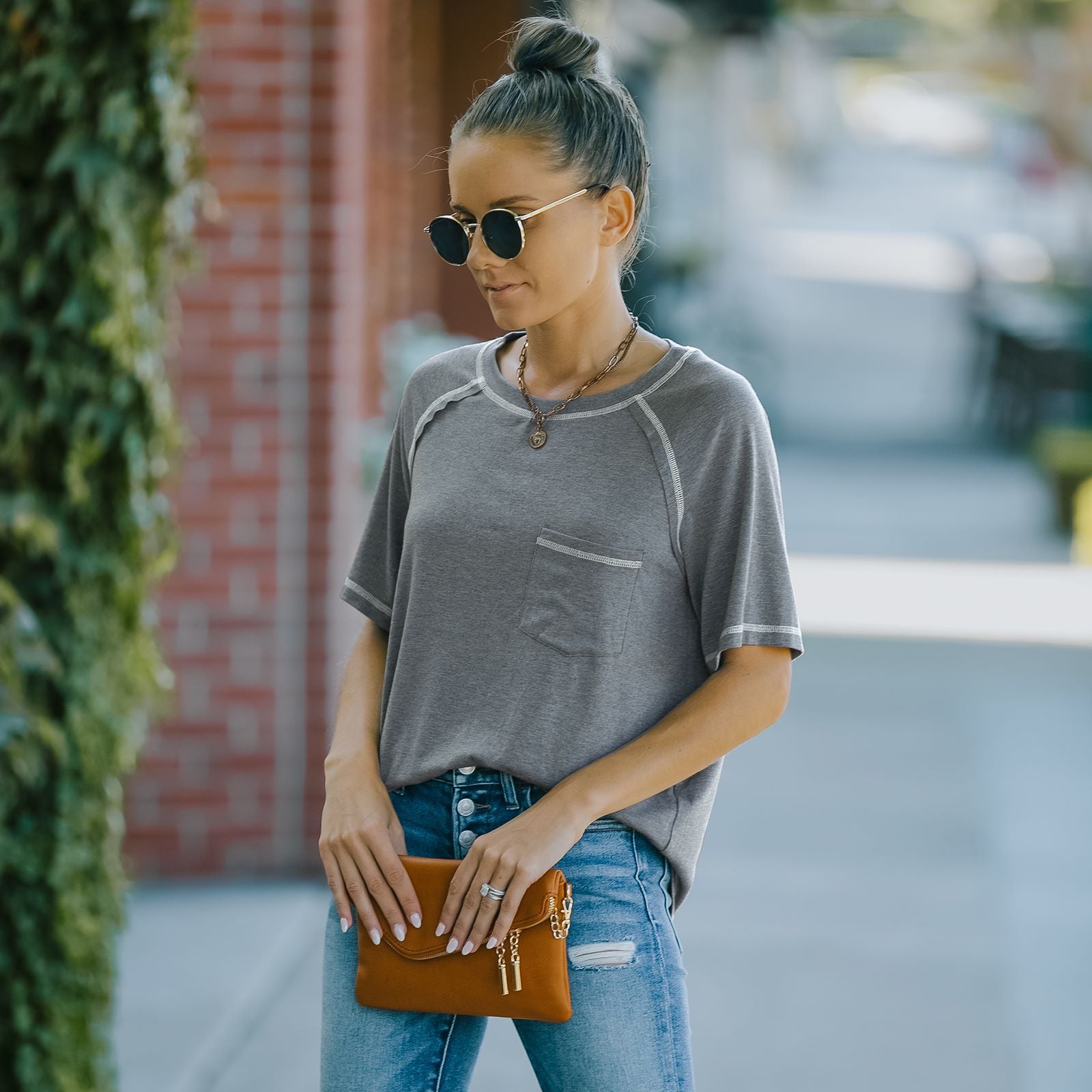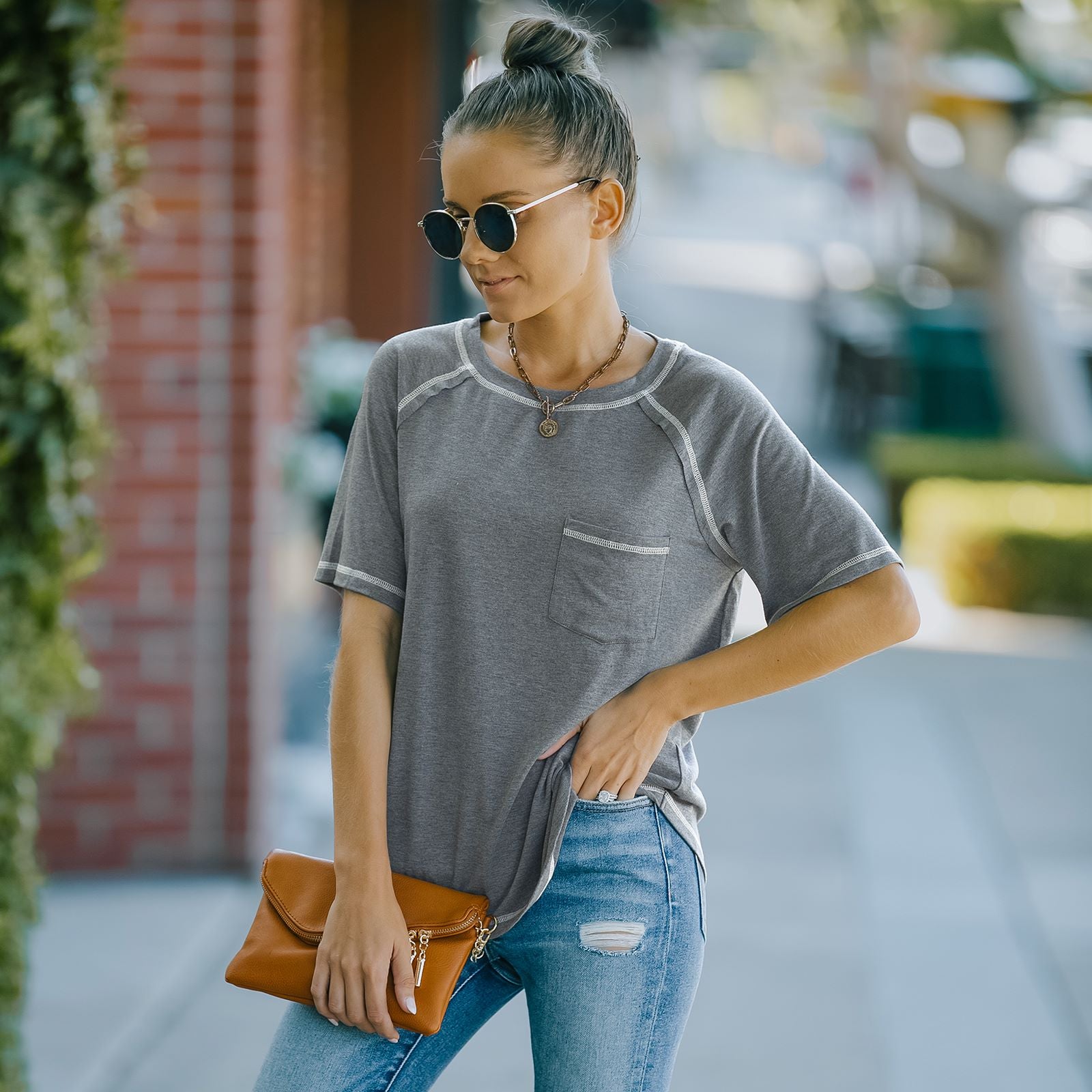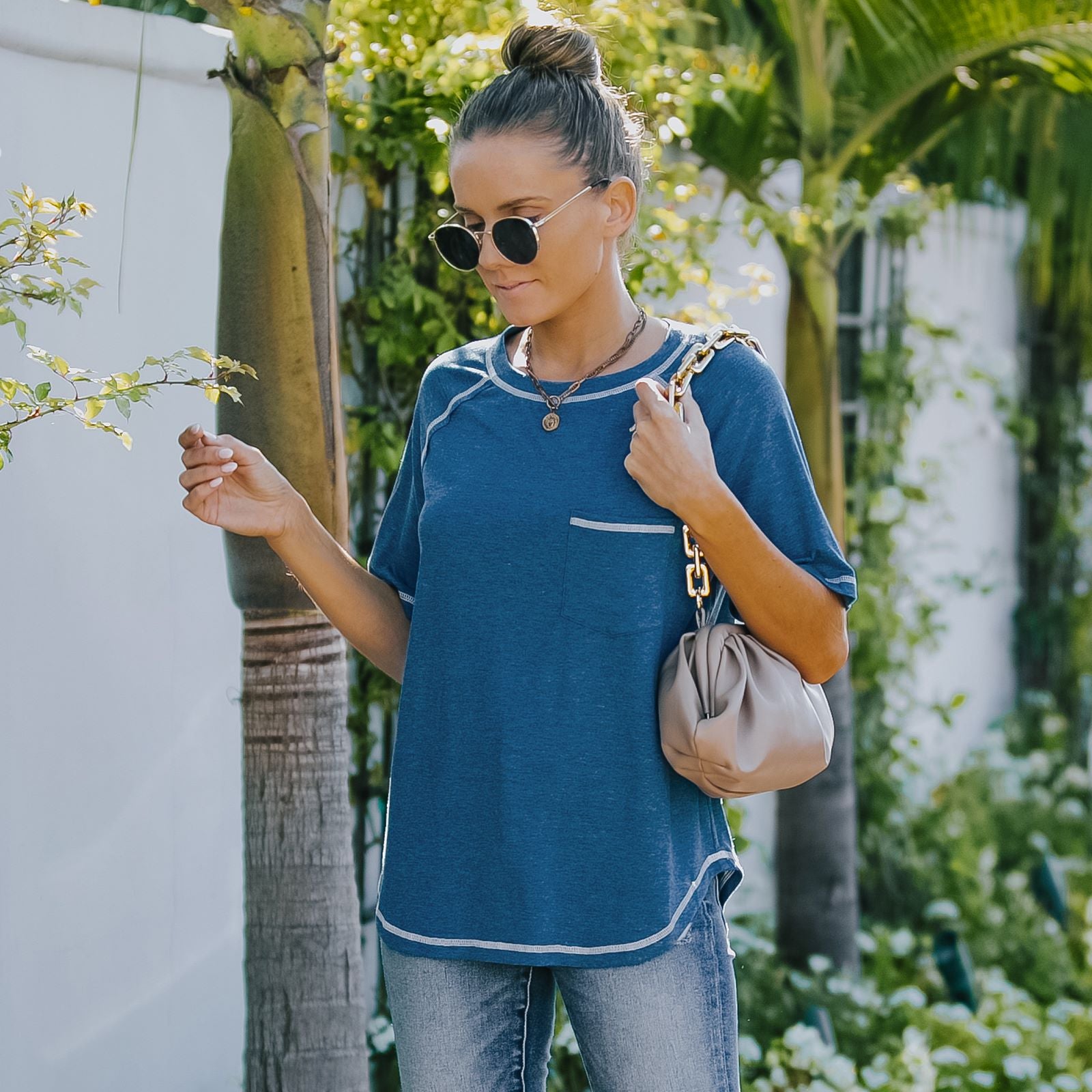 Camiseta básica de verano con cuello redondo, manga corta y bolsillo en el pecho